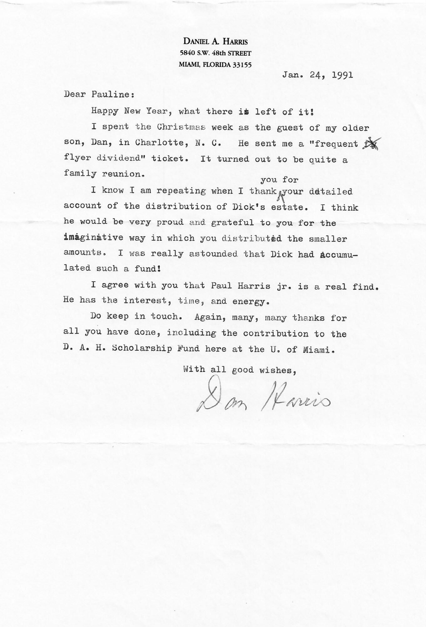 Do keep in touch. Again, many, many thanks for all you have done, including the contribution to the D. A. H. Scholarship Fund here at the U. of Miami.