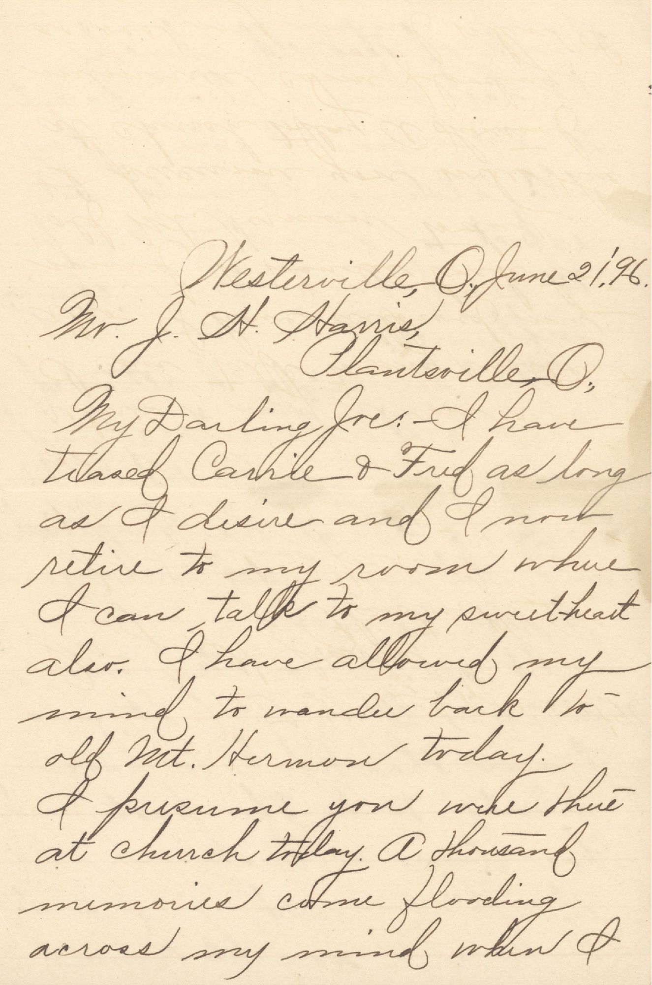 My Darling Joe: — I have teased Carrie & Fred as long as I desire and I now retire to my room where I can talk to my sweetheart also. I have allowed my mind to wander back to old Mt. Hermon today. I presume you were there at church today. A thousand memories come flooding across my mind when I think of that old church. It has been a dear parent to me. Can I ever repay it? Although I could not expect to live there I hope to send back some cheering influence.