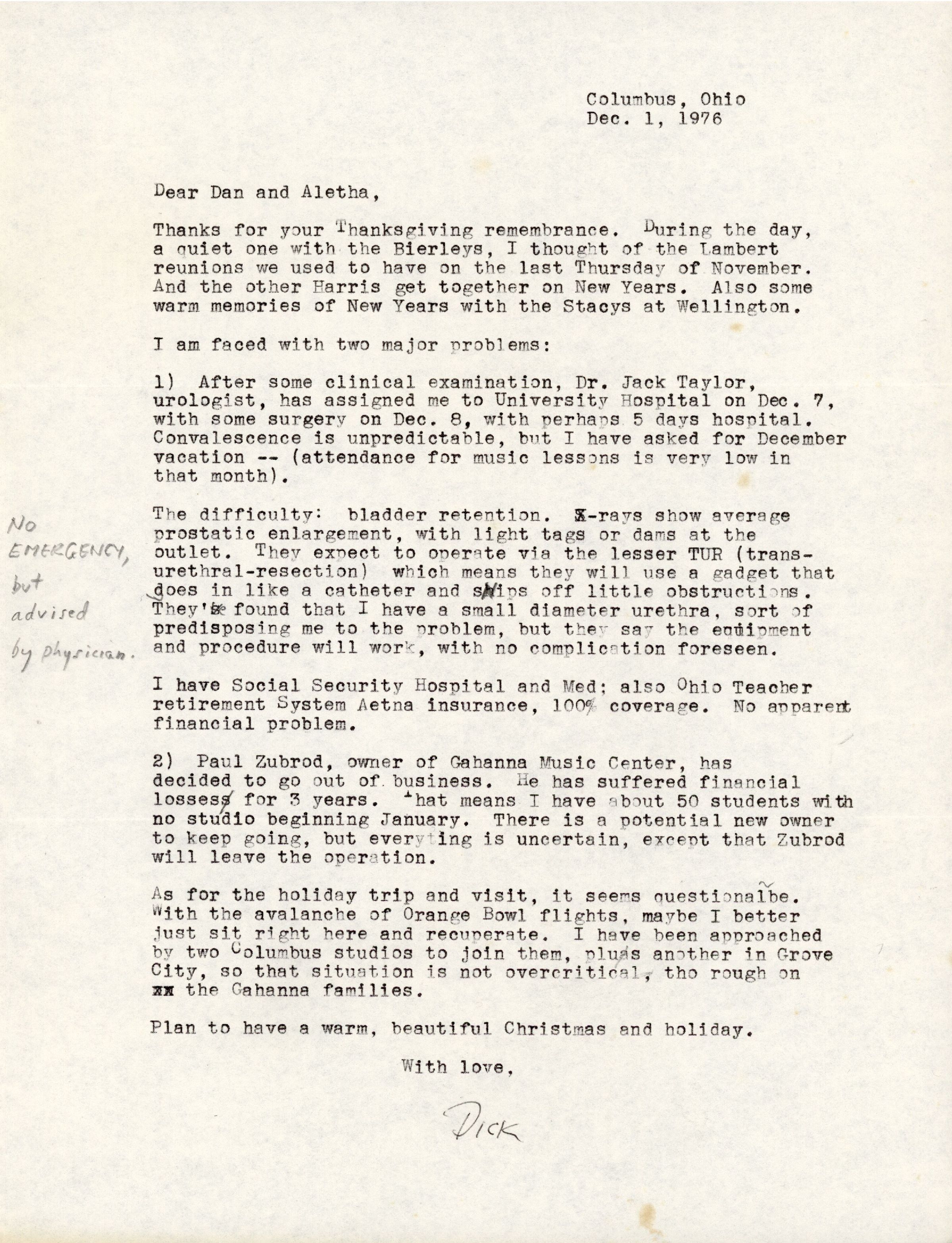 1) After some clinical examination, Dr. Jack Taylor, urologist, has assigned me to University Hospital on Dec. 7, with some surgery on Dec. 8, with perhaps 5 days hospital. Convalescence is unpredictable, but I have asked for December vacation -- (attendance for music lessons is very low that month).