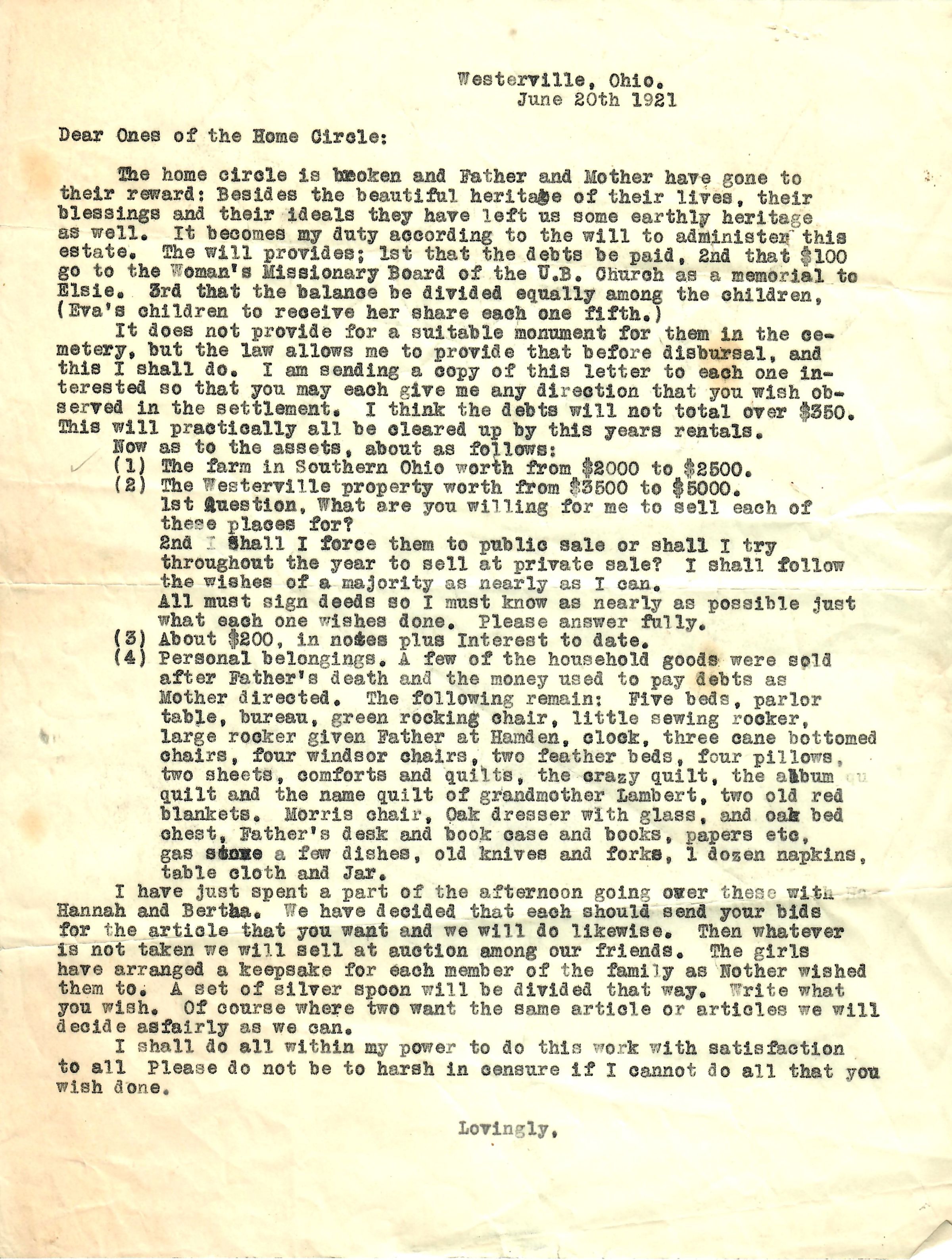 The home circle is broken and Father and Mother have gone to their reward: Besides the beautiful heritage of their lives, their blessings and their ideals they have left us some earthly heritage as well. It becomes my duty according to the will to administer this estate. The will provides; 1st that the debts be paid, 2nd that $100 go to the Woman's Missionary Board of the U.B. Church as a memorial to Elsie. 3rd that the balance be divided equally among the children, (Eva's children to receive her share each one fifth.)
