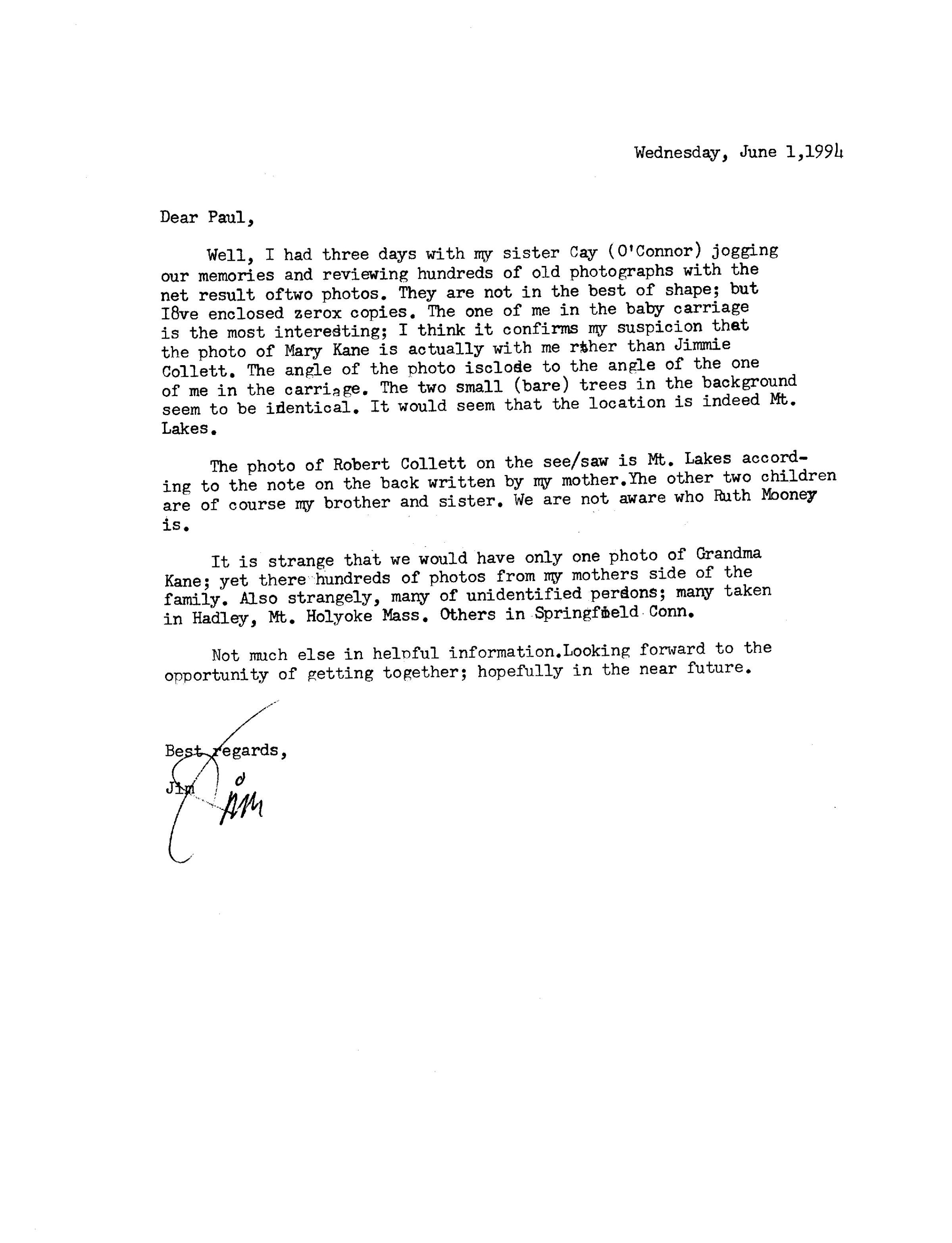 Well, I had three days with my sister Cay (O'Connor) jogging our memories and reviewing hundreds of old photographs with the net result of two photos. They are not in the best of shape; but I've enclosed zerox copies. The one of me in the baby carriage is the most interesting; I think it confirms my suspicion that the photo of Mary Kane is actually with me rather than Jimmie Collett. The angle of the photo is close to the angle of the one of me in the carriage. The two small (bare) trees in the background seem to be identical. It would seem that the location is indeed Mt. Lakes.