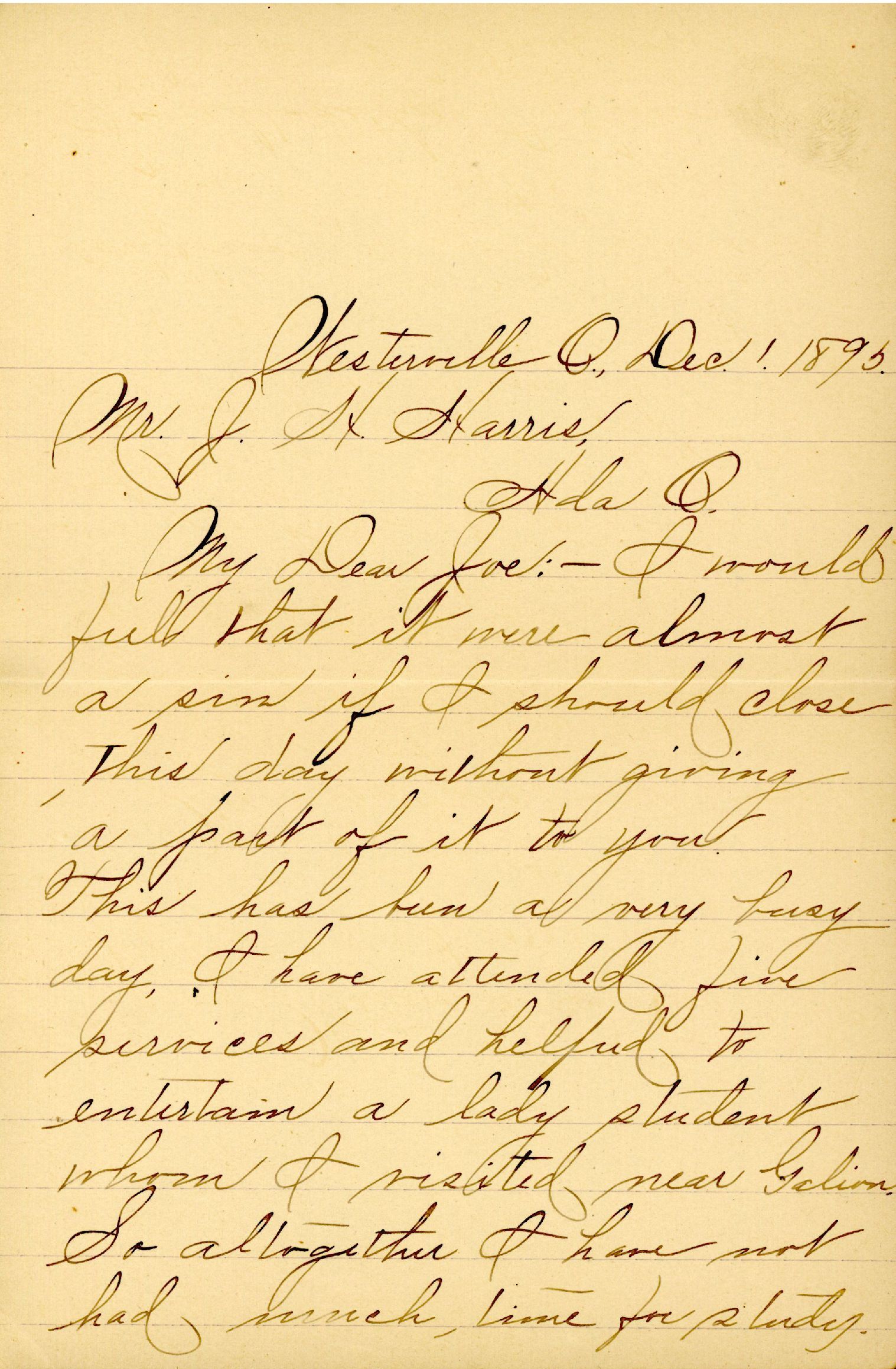 [Westerville, OH, to Mr. J. H. Harris, Ada, Ohio, Lock Box 28]