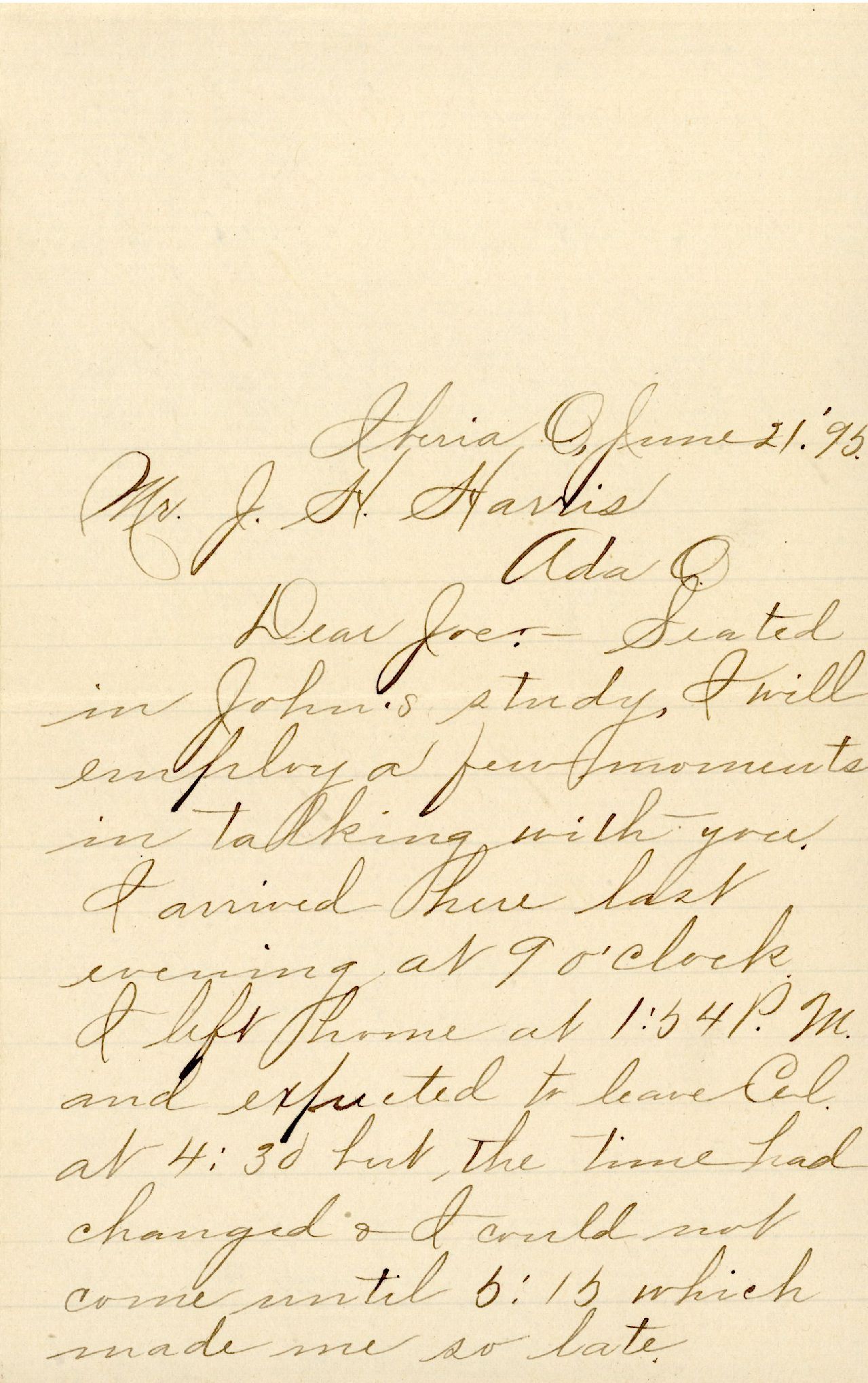 Dear Joe: — Seated in John's study, I will employ a few moments in talking with you. I arrived here last evening at 9 o'clock. I left home at 1:54 P.M. and expected to leave Col. at 4:30 but the time had changed & I could not come until 5:15 which made me so late.