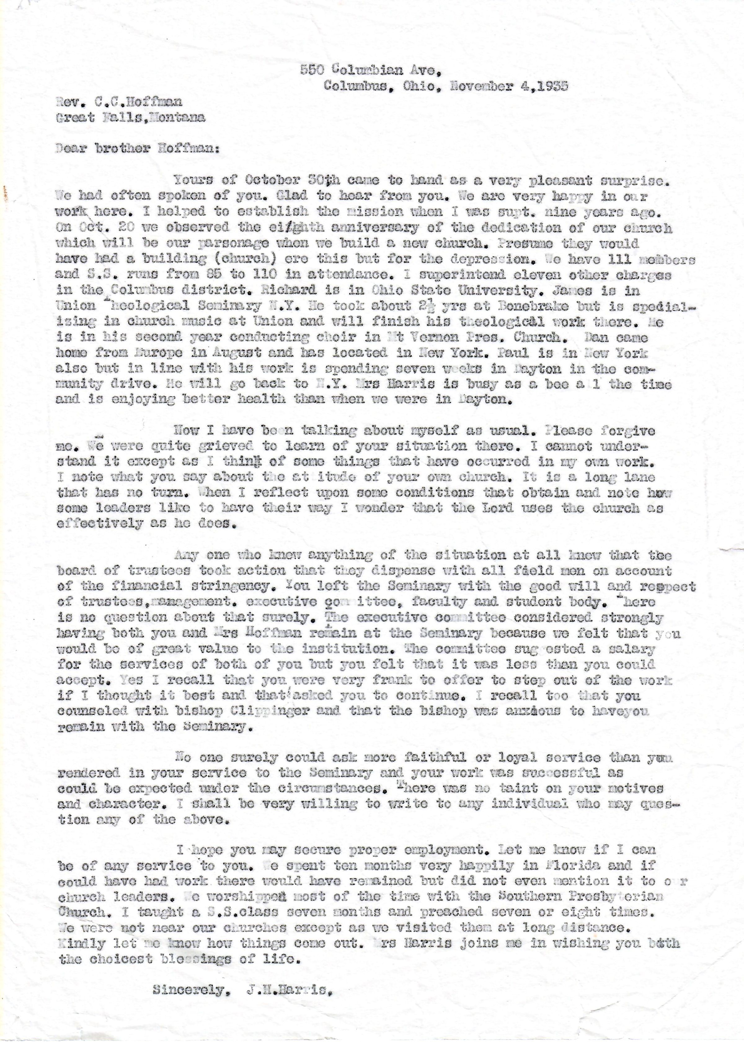 Yours of October 30th came to hand as a very pleasant surprise. We had often spoken of you. Glad to hear from you. We are very happy in our work here. I helped to establish the mission when I was supt. nine years ago. On Oct. 20 we observed the eighth anniversary of the dedication of our church which will be our parsonage when we build a new church. Presume they would have a building (church) ere this but for the depression. We have 111 members and S.S. runs from 85 to 110 in attendance. I superintend eleven other charges in the Collumbus district. Richard is in Ohio State University. James is in Union Theological Seminary N.Y. He took about 2 1/2 yrs at Bonebrake but is specialising [sic] in church music at Union and will finish his theological work there. He is in his second year conducting choir in Mt Vernon Pres. Church. Dan came home from Europe in August and has located in New York. Paul is in New York also but in line with his work is spending seven weeks in Dayton in the community drive. He will go back to N.Y. Mrs Harris is busy as a bee all the time and is enjoying better health than when you were in Dayton.