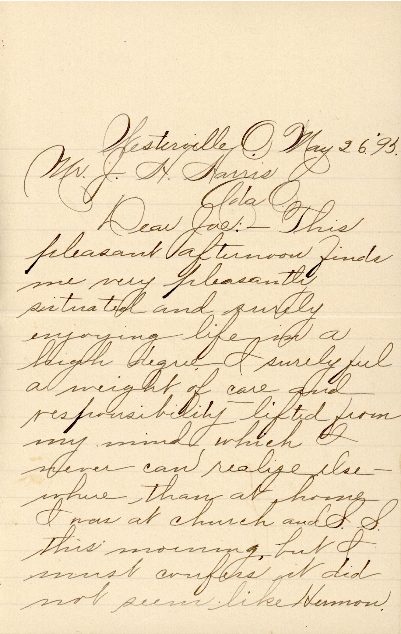 Dear Joe: — This pleasant afternoon finds me very pleasantly situated and surely enjoying life in a high degree. I surely feel a weight of care and responsibility lifted from my mind which I never can realize elsewhere than at home. I was at church this morning, but I must confess it did not seem like Hermon. I believe it is going to take me some time to become acclimated. John & Hannah drove down Wed. and went back Sat. We had a nice visit but John was sick so he was not able to go to Carrie's commencement. I had decided to go to Iberia immediately after College commencement. I thought I had best stay that long and get some of the moss worn off. I have been asked to help in the music for our Open Session for commencement week and I thought that would do me good also. Hannah thinks there will be a good opening for me but of course I can not tell much about it.