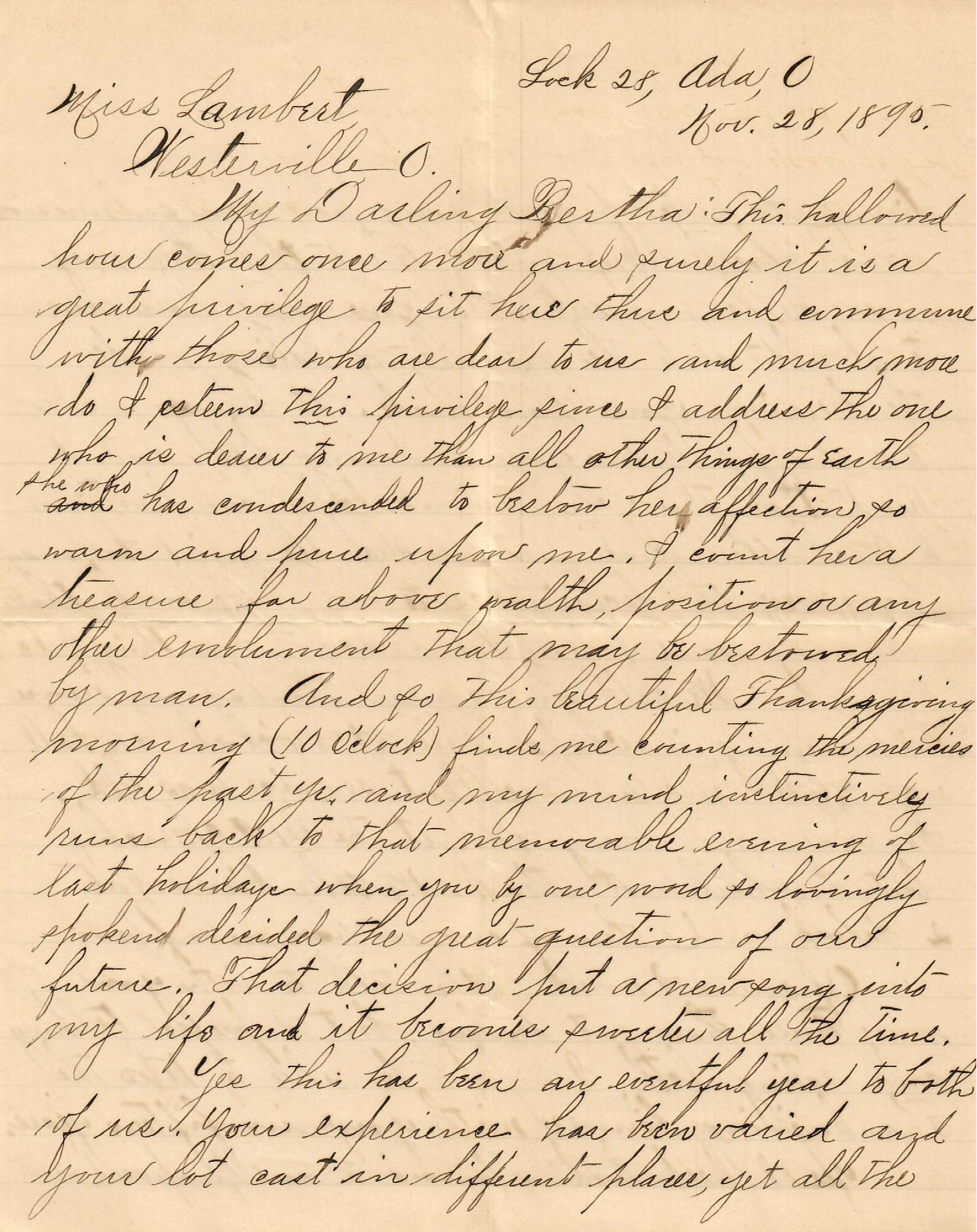 My Darling Bertha: This hallowed hour comes once more and surely it is a great privilege to sit here thus and commune with those who are dear to us and much more do I esteem this privilege since I address the one who is dearer to me than all other things of earth, she who has condescended to bestow her affection so warm and pure upon me. I count her a treasure far above wealth, position or any other emolument that may be bestowed by man. And so this beautiful Thanksgiving morning (10 o'clock) finds me counting the mercies of the past yr. and my mind instinctively runs back to that memorable evening of last holidays when you by one word so lovingly spoken decided the great question of our future. That decision put a new song into my life and it becomes sweeter all the time.