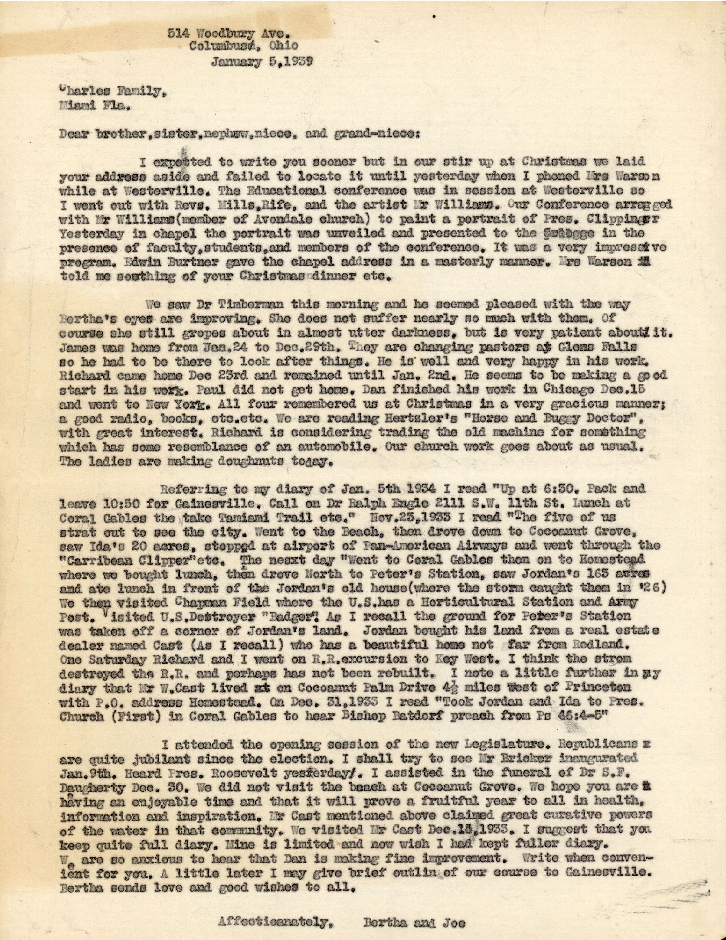 I attended the opening session of the new Legislature. Republicans are quite jubilant since the election. I shall try to see Mr Bricker inaugurated Jan. 9th. Heard Pres. Roosevelt yesterday. I assisted in the funeral of Dr S. F. Daugherty Dec. 30. We did not visit the beach at Cocoanut Grove. We hope your are having an enjoyable time and that it will prove a fruitful year to all in health, information and inspiration. Mr Cast mentioned above claimed great curative powers of the water in that community. We visited Mr Cast Dec. 13, 1933. I suggest that you keep quite full diary. Mine is limited and now wish I had kept fuller diary. We are anxious to hear that Dan is making fine improvement. Write when convenient for you. A little later I may give brief outline of our course to Gainesville. Bertha sends love and good wishes to all.