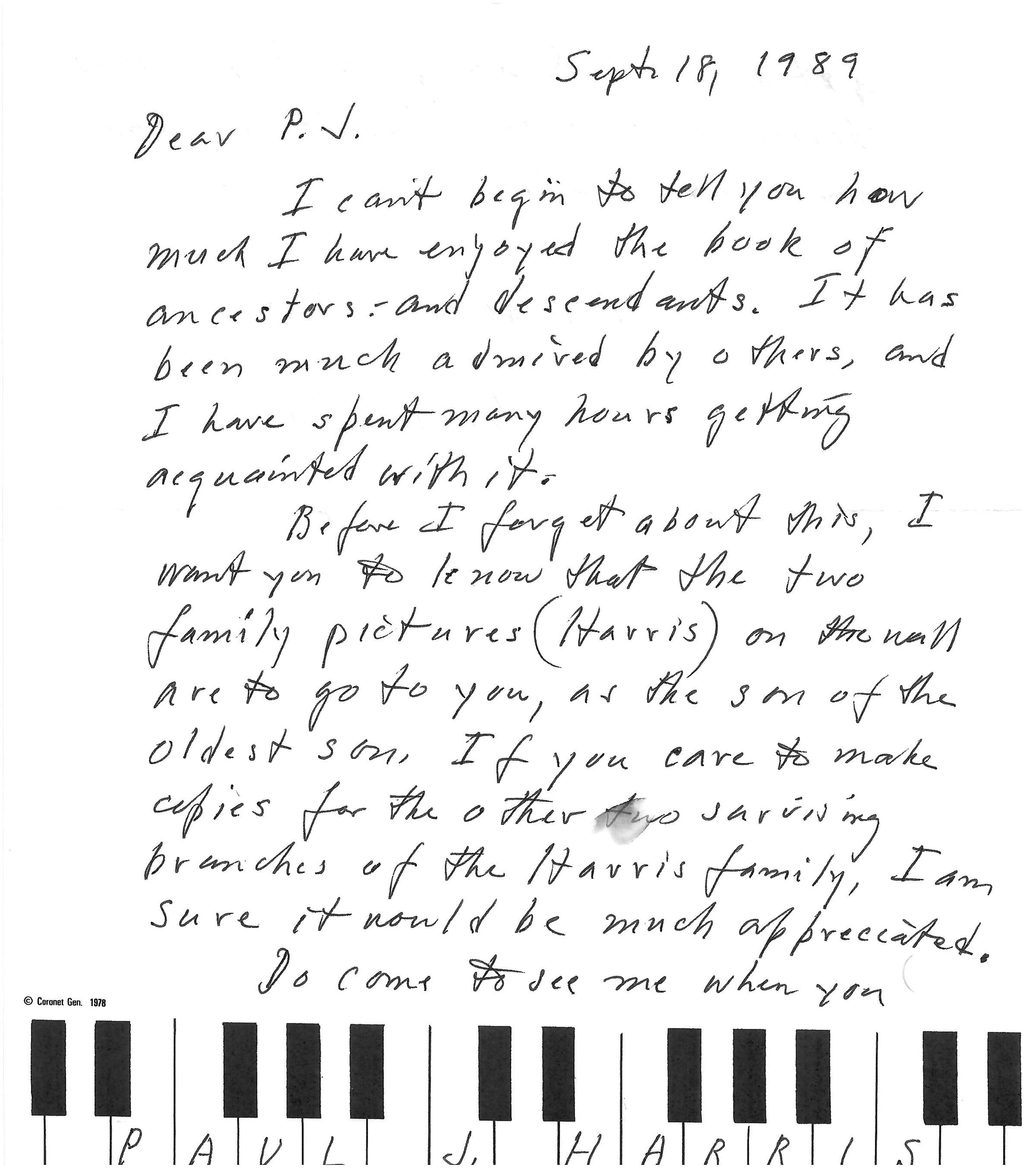 Before I forget about this, I want you to know that the two family pictures (Harris) on the wall are to go to you, as the son of the oldest son. If you care to make copies for the other two surviving branches of the Harris family, I am sure it would be much appreciated.