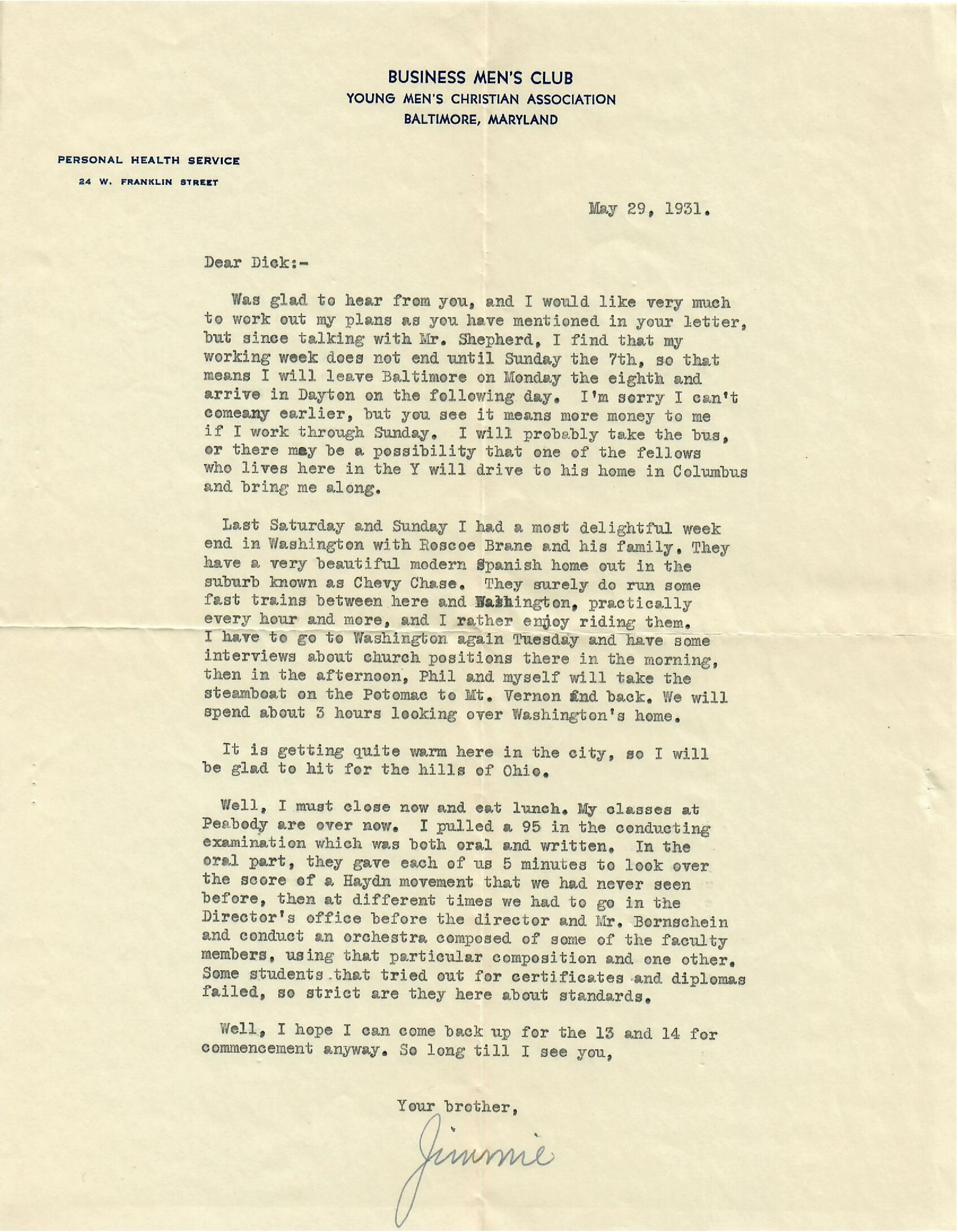 Well, I must close now and eat lunch. My classes at Peabody are over now. I pulled a 95 in the conducting examination which was both oral and written. In the oral part, they gave each of us 5 minutes to look over the score of a Haydn movement that we had never seen before, then at different times we had to go in the Director's office before the director and Mr. Bornschein and conduct an orchestra composed of some of the faculty members, using that particular composition and one other. Some students that tried out for certificates and diplomas failed, so strict are they here about standards.