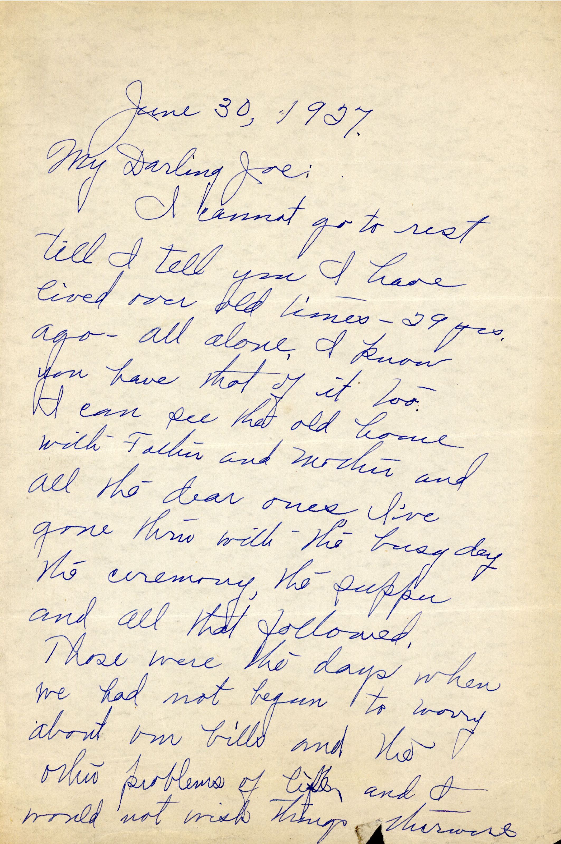 I cannot go to rest till I tell you I have lived over old times - 29 yrs. ago - all alone. I know you have thot of it too. I can see the old house with Father and Mother and all the dear ones, I've gone thru with the busy day the ceremony, the supper and all that followed. Those were the days when we had not begun to worry about our bills and the other problems of life, and I would not wish things otherwise if I had it all to live over after all these years. I wonder sometimes if I am the same girl, but my senses tell me I am but only changed.