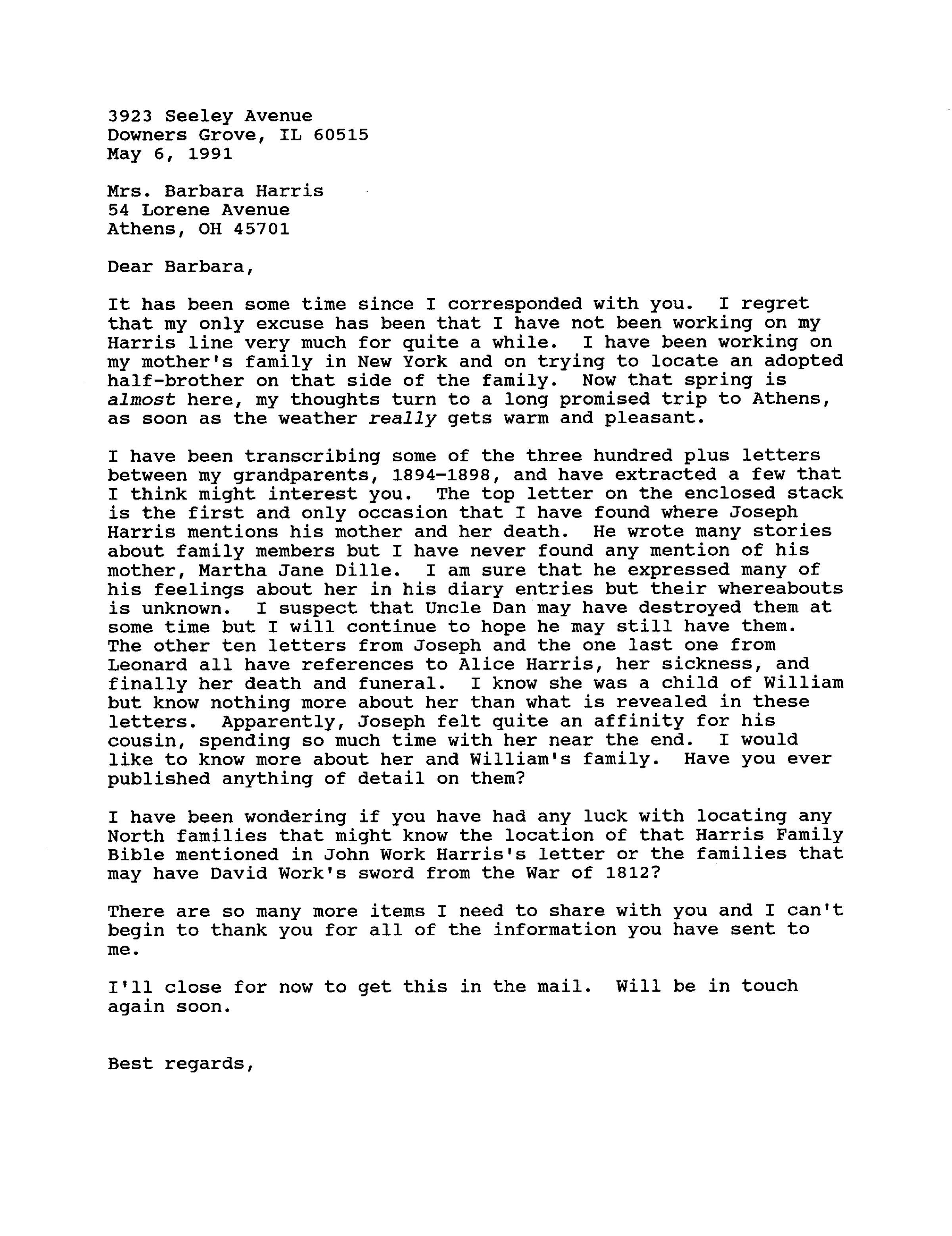 It has been some time since I corresponded with you. I regret that my only excuse has been that I have not been working on my Harris line very much for quite a while. I have been working on my mother's family in New York and on trying to locate an adopted