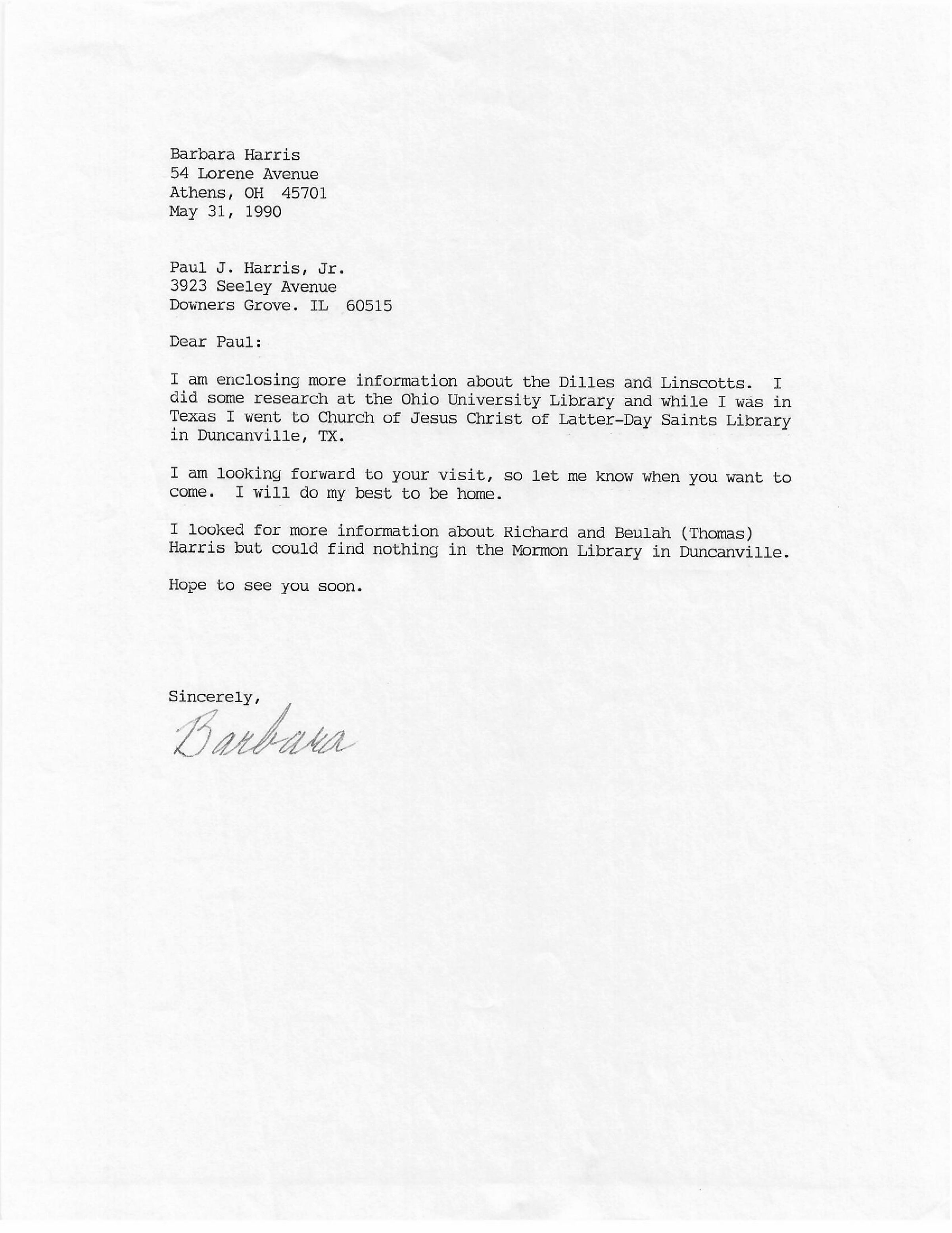 AU Gooding, Barbara [Harris] - 1990-05-31 letter to Paul J. Harris, Jr.Entry/Object ID