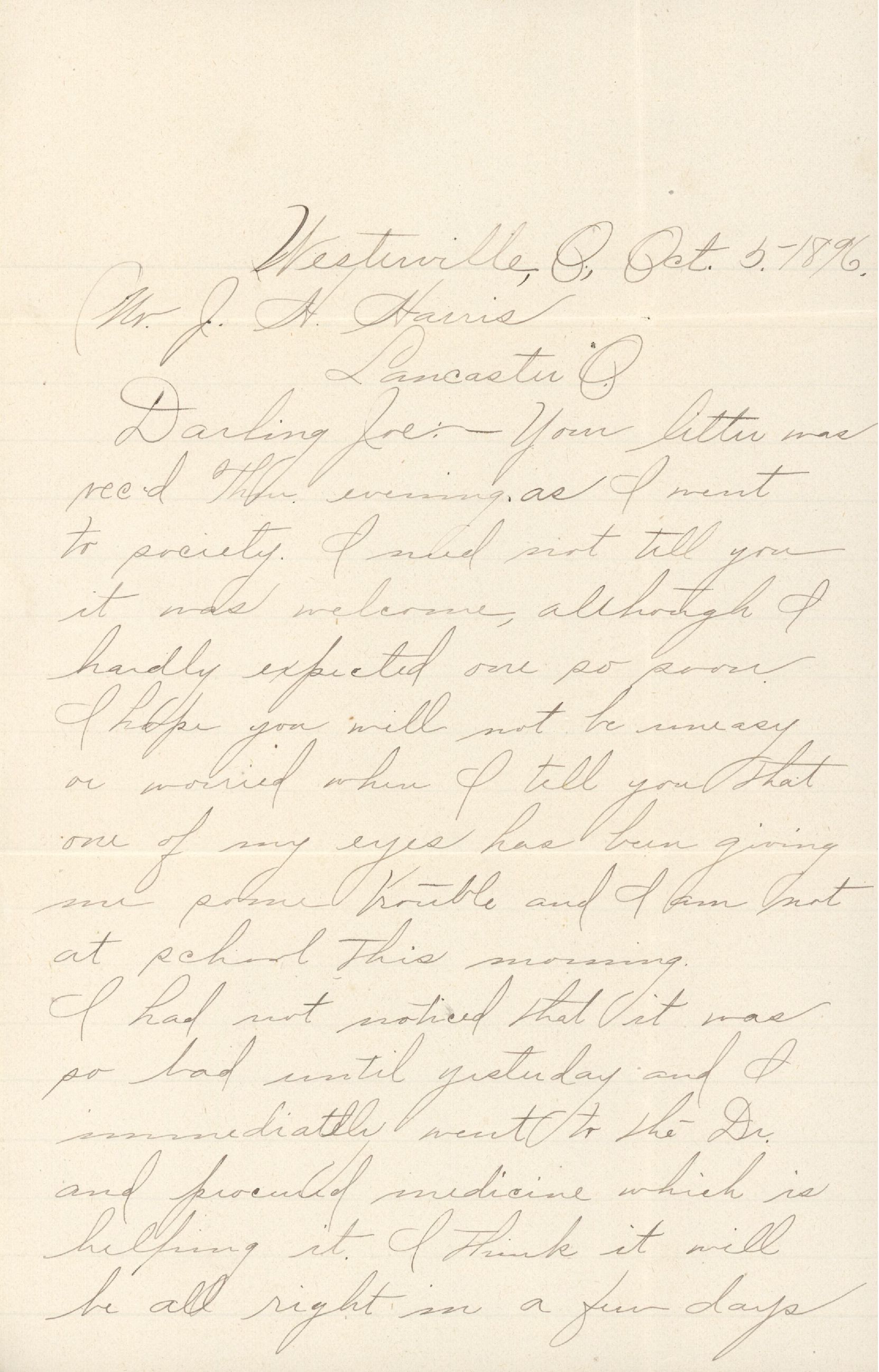 Darling Joe: — Your letter was rec'd Thur. evening as I went to society. I need not tell you it was welcome, although I hardly expected one so soon. I hope you will not be uneasy or worried when I tell you that one of my eyes has been giving me some trouble and I am not at school this morning.