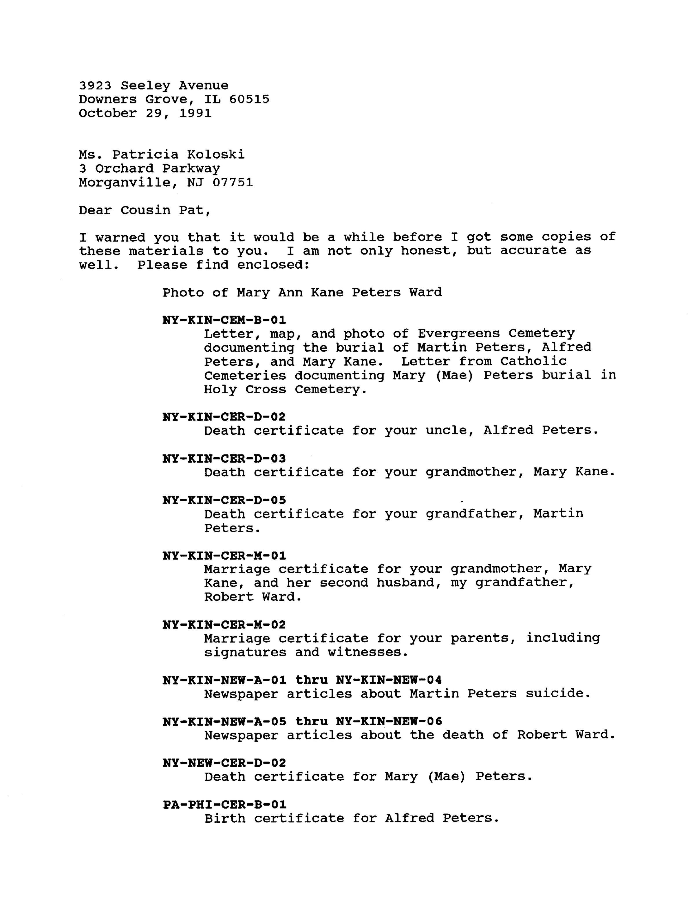 I know I have dumped a lot of material on you at one time, but a lot of the work has already been done for you. It takes a lot of time to digest it all and make some sense of it. You will have many questions, as do I. For example, I still do not know where your grandparents, Martin Peters and Mary Kane, were married, about 1890. If you come up with anything, please let me know. Feel free to contact me or Helen at any time for any questions you have or if you just need someone to talk to.