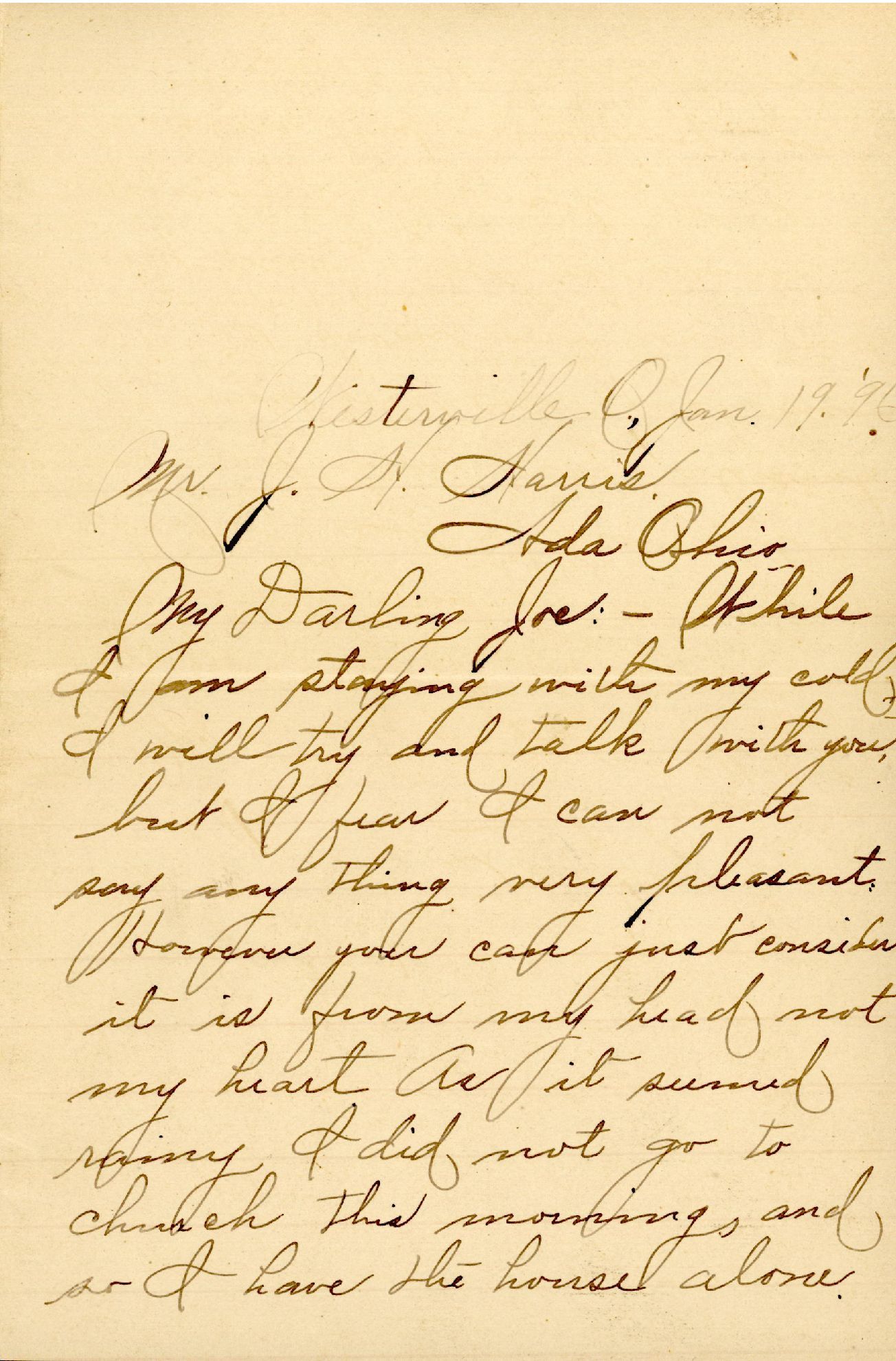 My Darling Joe: — While I am staying with my cold I will try and talk with you, but I fear I can not say any thing very pleasant. However you can just consider it is from my head not my heart. As it seemed rainy I did not go to church this morning and so I have the house alone.