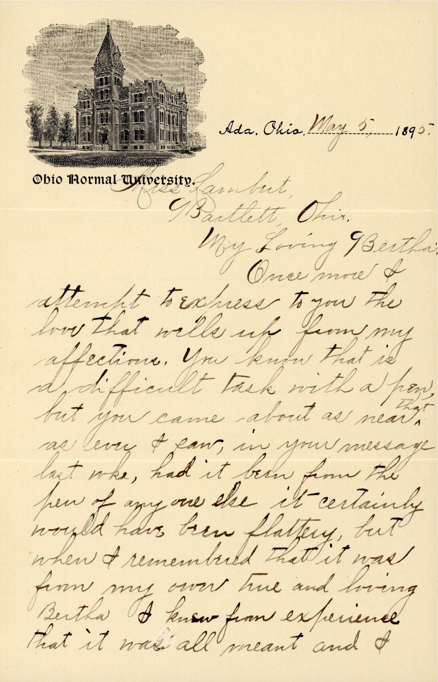 [Ada, OH, to Miss Bertha Lambert, Bartlett, Ohio, “Washington Co.” on Ohio Normal University stationery.]