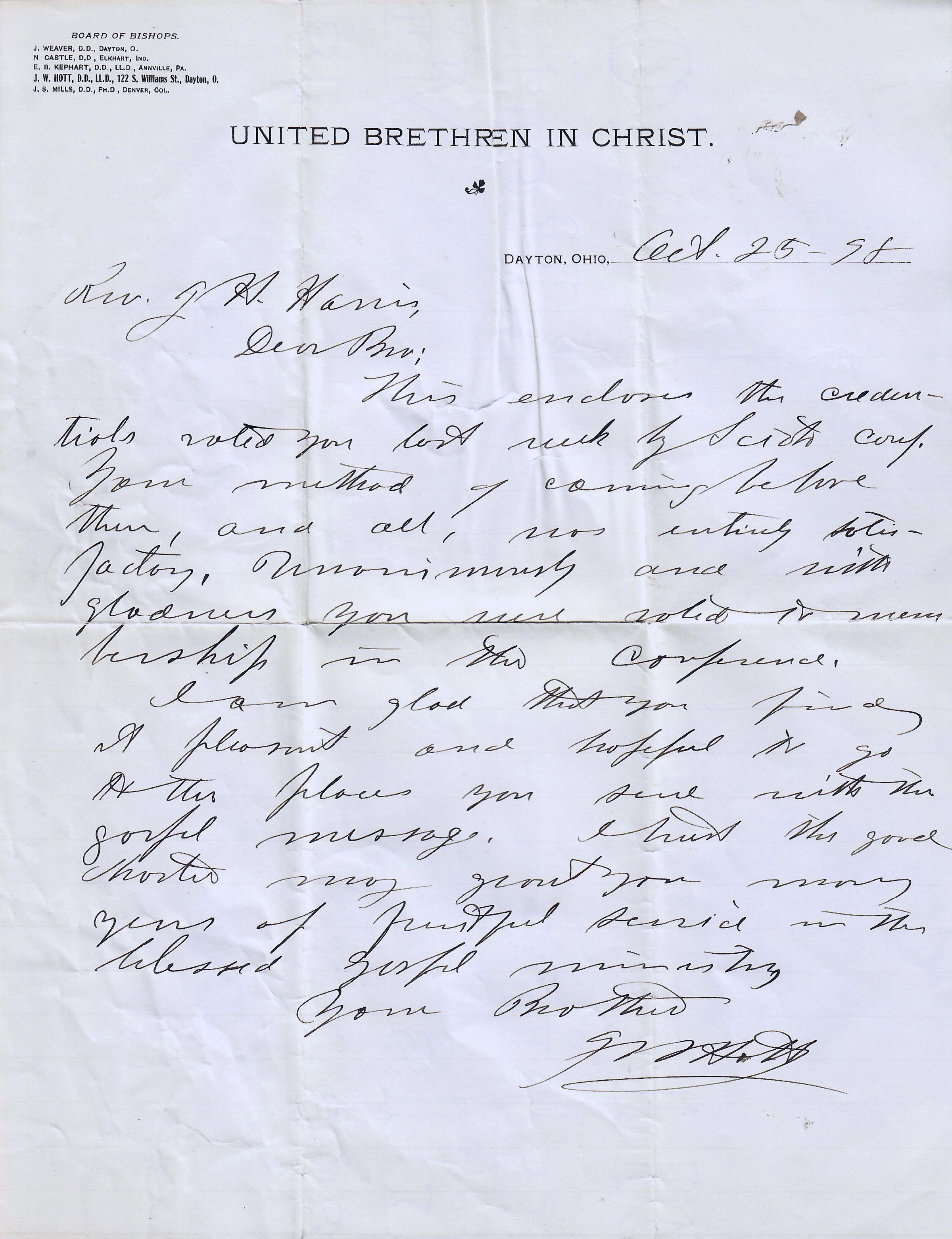 AU Hott, J. W. - 1898-10-25 letter to Joseph Hastings HarrisEntry/Object ID