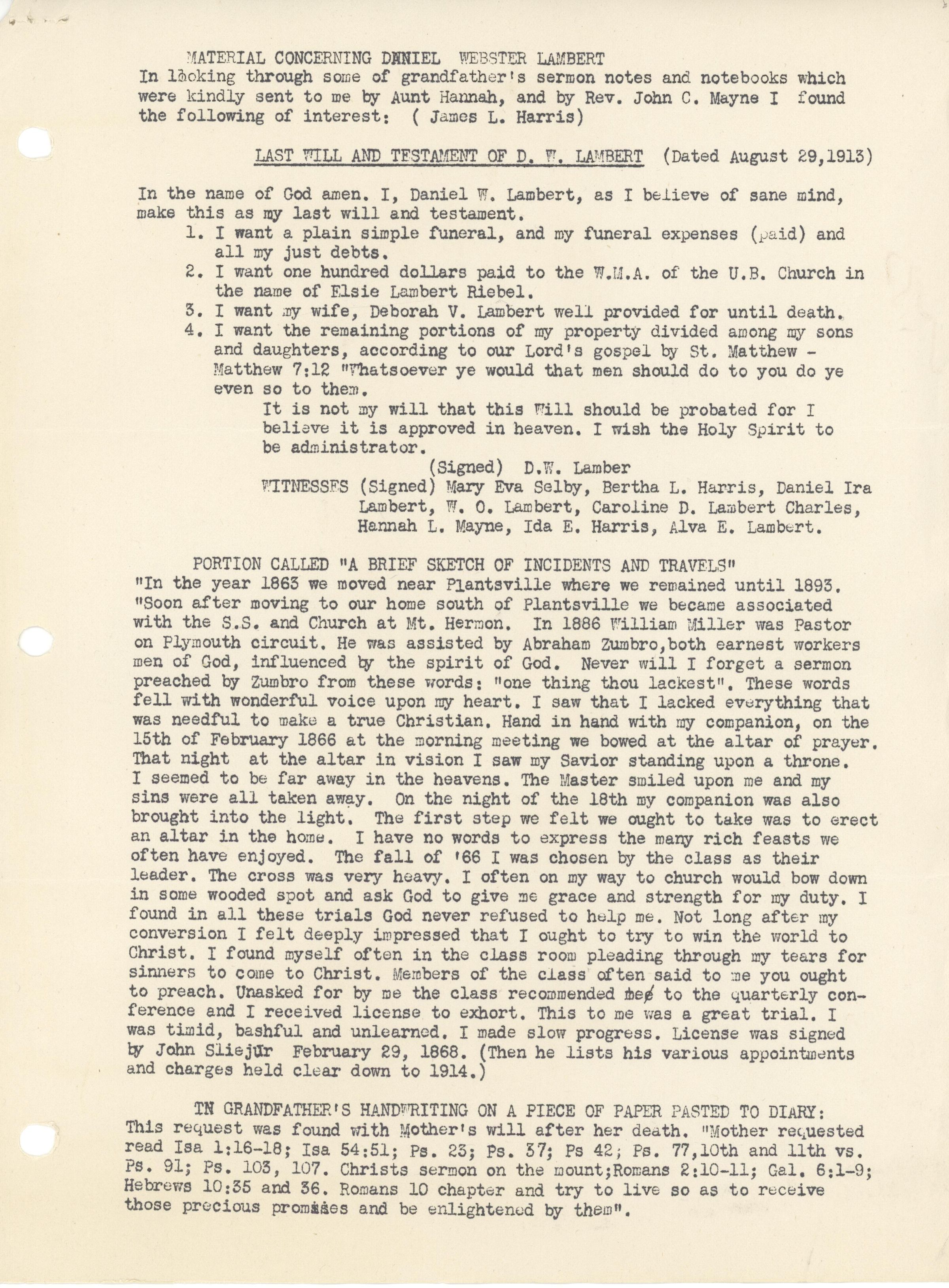 MATERIAL CONCERNING DANIEL WEBSTER LAMBERT