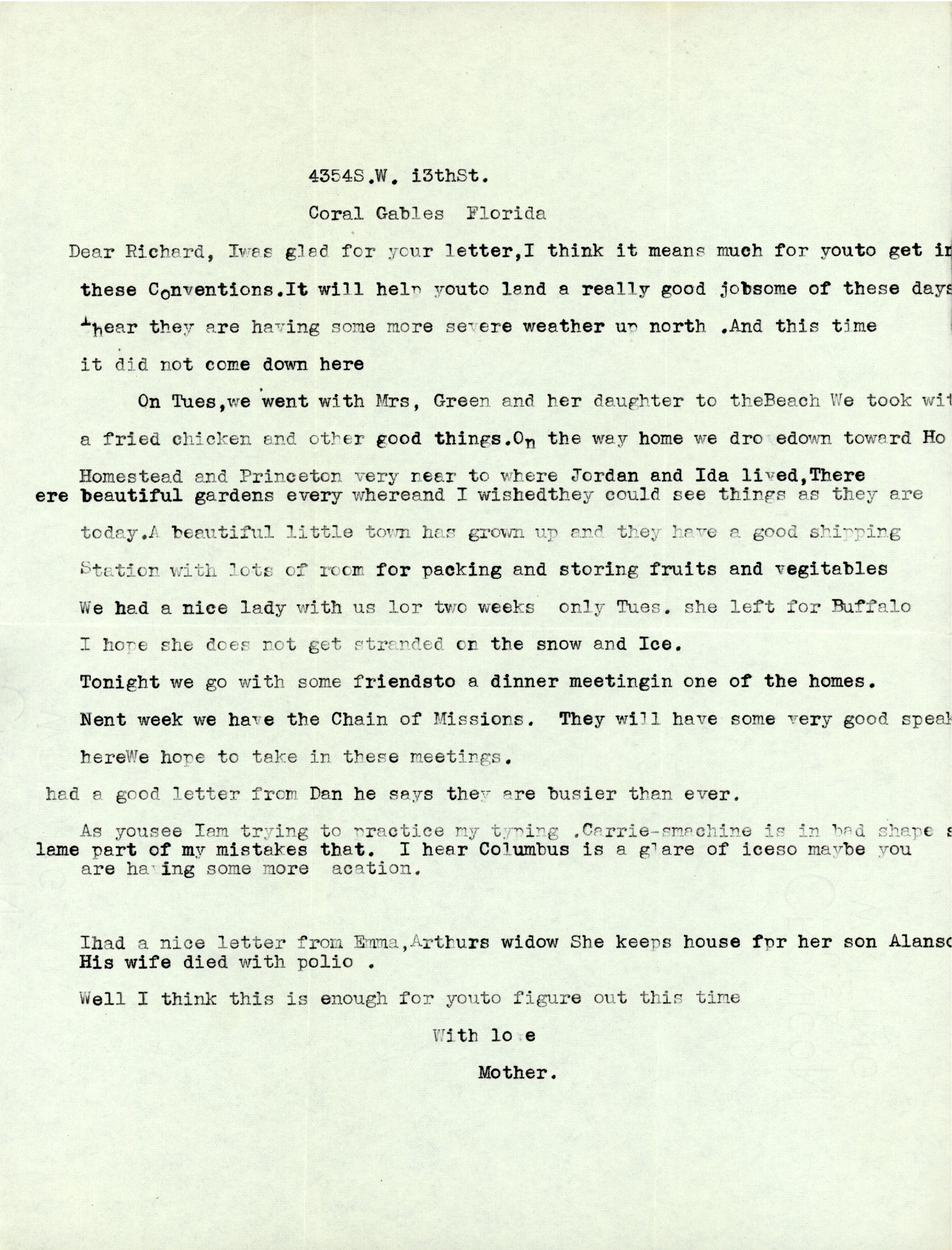 Dear Richard, I was glad for your letter, I think it means much for you to get in these Conventions. It will help you to land a really good job some of these days. I hear they are having some more severe weather up north. And this time it did not come down here.