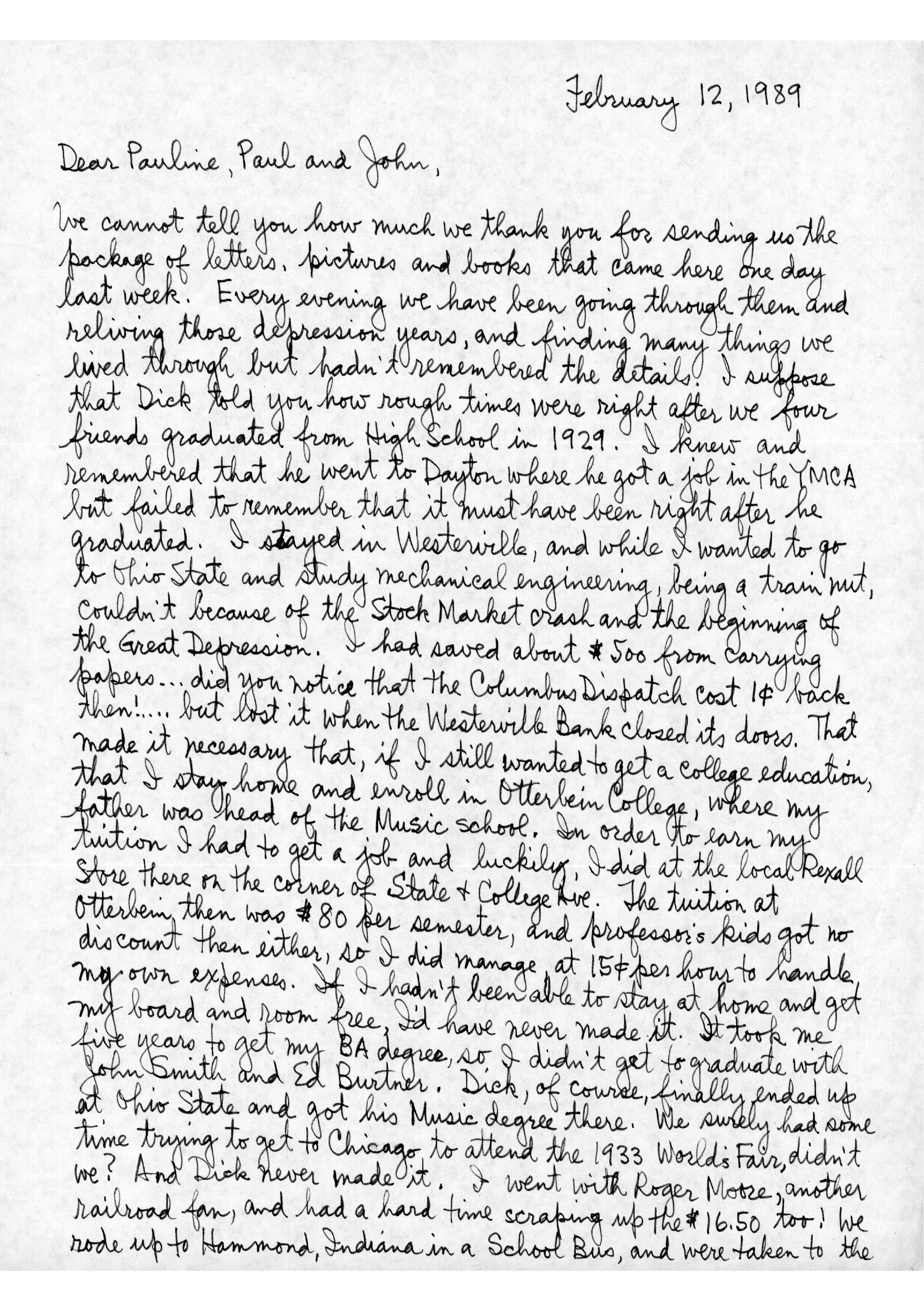 We cannot tell you how much we thank you for sending us the package of letters, pictures and books that came here one day last week. Every evening we have been going through them and reliving those depression years, and finding many things we lived through but hadn't remembered the details. I suppose that Dick told you how rough times were right after we four friends graduated from High School in 1929. I knew and remembered that he went to Dayton where he got a job in the YMCA but failed to remember that it must have been right after he graduated. I stayed in Westerville, and while I wanted to go to Ohio State and study mechanical engineering, being a train nut, couldn't because of the Stock Market crash and the beginning of the Great Depression. I had saved about $500 from carrying papers... did you notice that the Columbus Dispatch cost 1ȼ back then!... but lost it when the Westerville Bank closed its doors. That made it necessary that, if I still wanted to get a college education, that I stay home and enroll in Otterbein College, where my father was head of the Music School. In order to earn my tuition I had to get a job and luckily, I did at the local Rexall Store there on the corner of State & College Ave. The tuition at Otterbein then was $80 per semester, and professor's kids got no discount then either, so I did manage at 15ȼ per hour to handle my own expenses. If I hadn't been able to stay at home and get my board and room free, I'd have never made it. It took me five years to get my BA degree, so I didn't get to graduate with John Smith and Ed Burtner. Dick, of course, finally ended up at Ohio State and got his Music degree there. We surely had some time trying to Chicago to attend the 1933 World's Fair, didn't we? And Dick never made it. I went with Roger Moore, another railroad fan, and had a hard time scraping up the $16.50 too! We rode up to Hammond, Indiana in a School Bus, and were taken to the