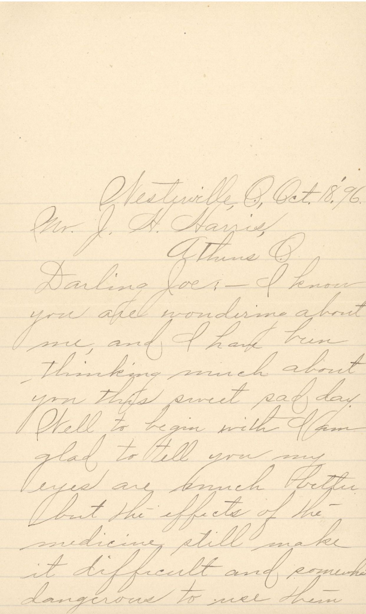 Darling Joe: — I know you are wondering about me, and I have been thinking much about you this sweet sad day. Well to begin with I am glad to tell you my eyes are much better, but the effects of the medicine still make it difficult and somewhat dangerous to use them very much at close work so I will only write a little. The Dr. says they will be well in a few days but not strong enough for close work for some time.