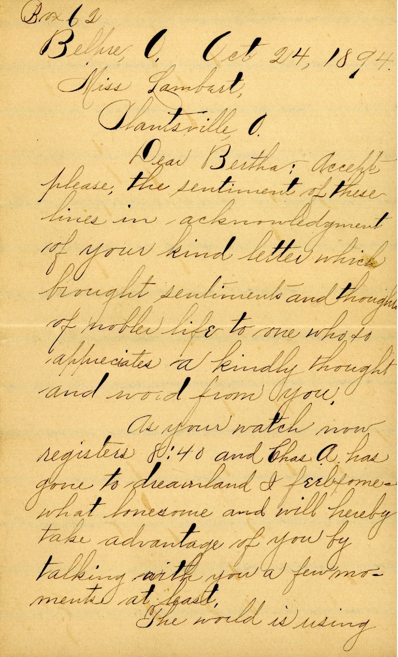 Letter from Joseph Hastings Harris (Belpre, Ohio) to Bertha Elizabeth Lambert (Plantsville, Ohio), 24 October 1894Context