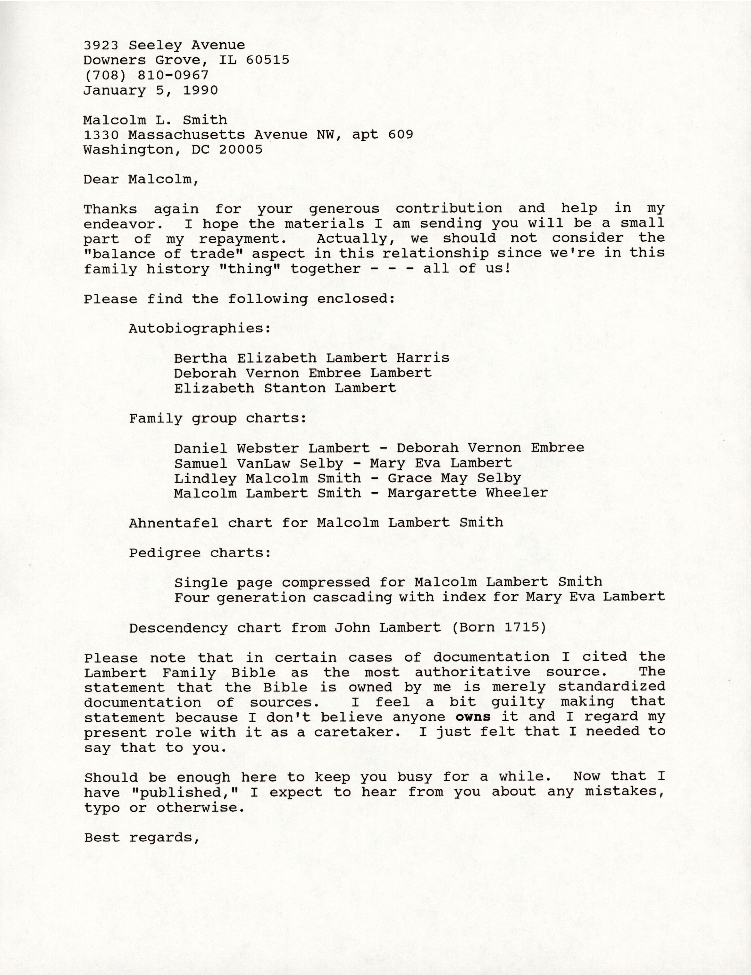 AU Harris, Paul Joseph Jr. - 1990-01-05 letter to Malcolm Lambert SmithEntry/Object ID