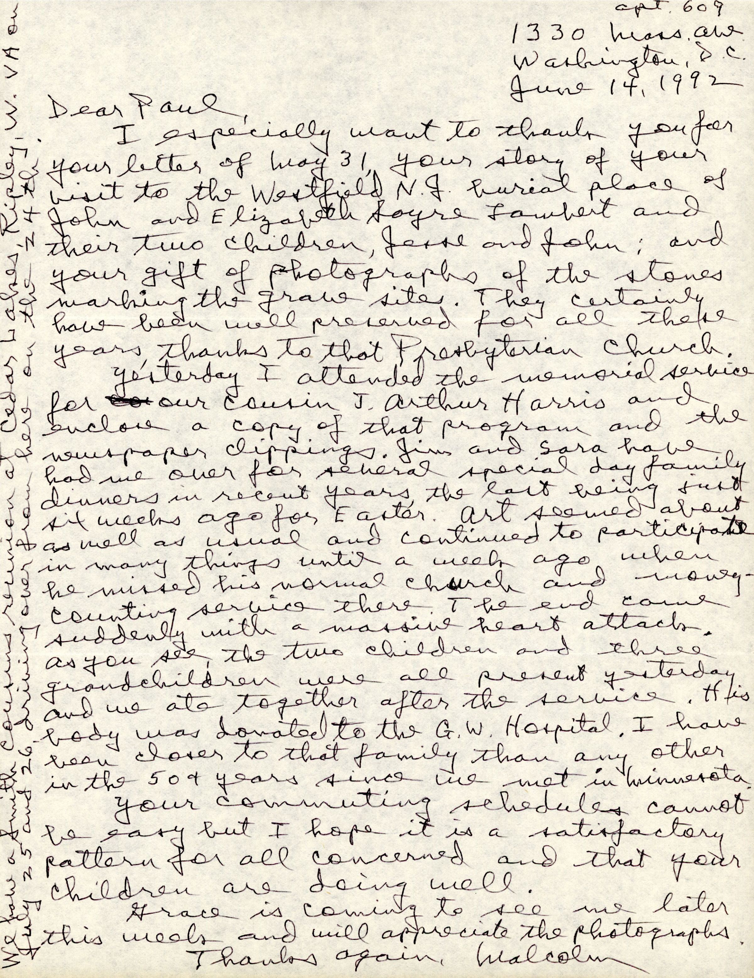 Yesterday I attended the memorial service for our cousin J. Arthur Harris and enclose a copy of that program and the newspaper clippings. Jim and Sara have had me over for several special day family dinners in recent years, the last being just six weeks ago for Easter. Art seemed about as well as usual and continued to participate in many things until a week ago when he missed his normal church and money-county service there. The end came suddenly with a massive heart attack. As you see, the two children and three grandchildren were all present yesterday and we ate together after the service. His body was donated to the G. W. Hospital. I have been closer to that family than any other in the 50 + years since we met in Minnesota.