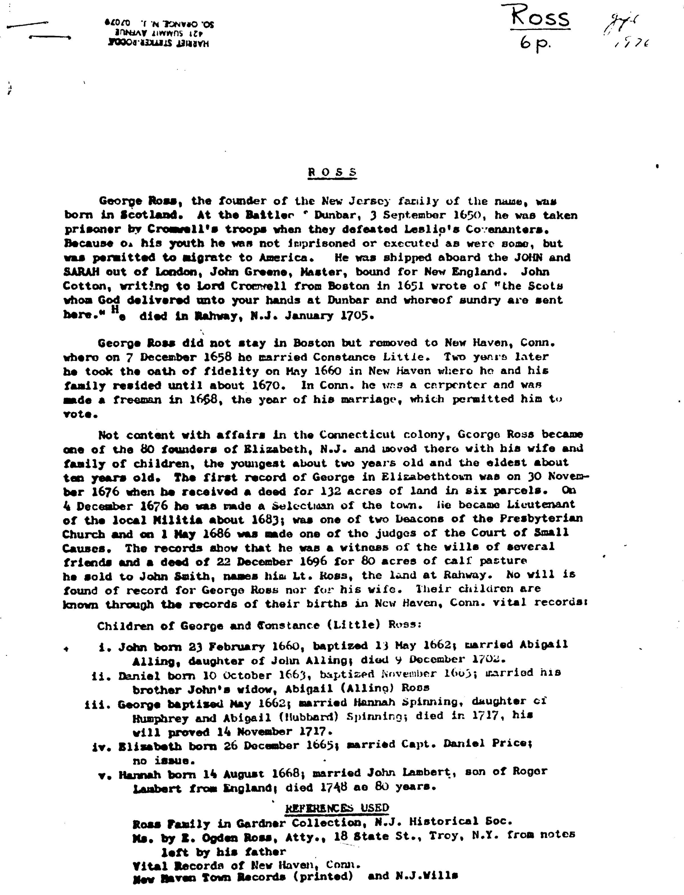 George Ross, the founder of the New Jersey family of the name, was born in Scotland. At the Battle of Dunbar, 3 September 1650, he was taken prisoner by Cromwell's troops when they defeated Leslie‘s Covenanters. Because of his youth he was not imprisoned or executed as were some, but was permitted to migrate to America. He was shipped aboard the JOHN and SARAH out of London, John Greene, Master, bound for New England. John Cotton, writing to Lord Cromwell from Boston in 1651 wrote of "the Scots whom God delivered unto your hands at Dunbar and whereof sundry are sent here.“ He died in Rahway, N.J. January 1705.