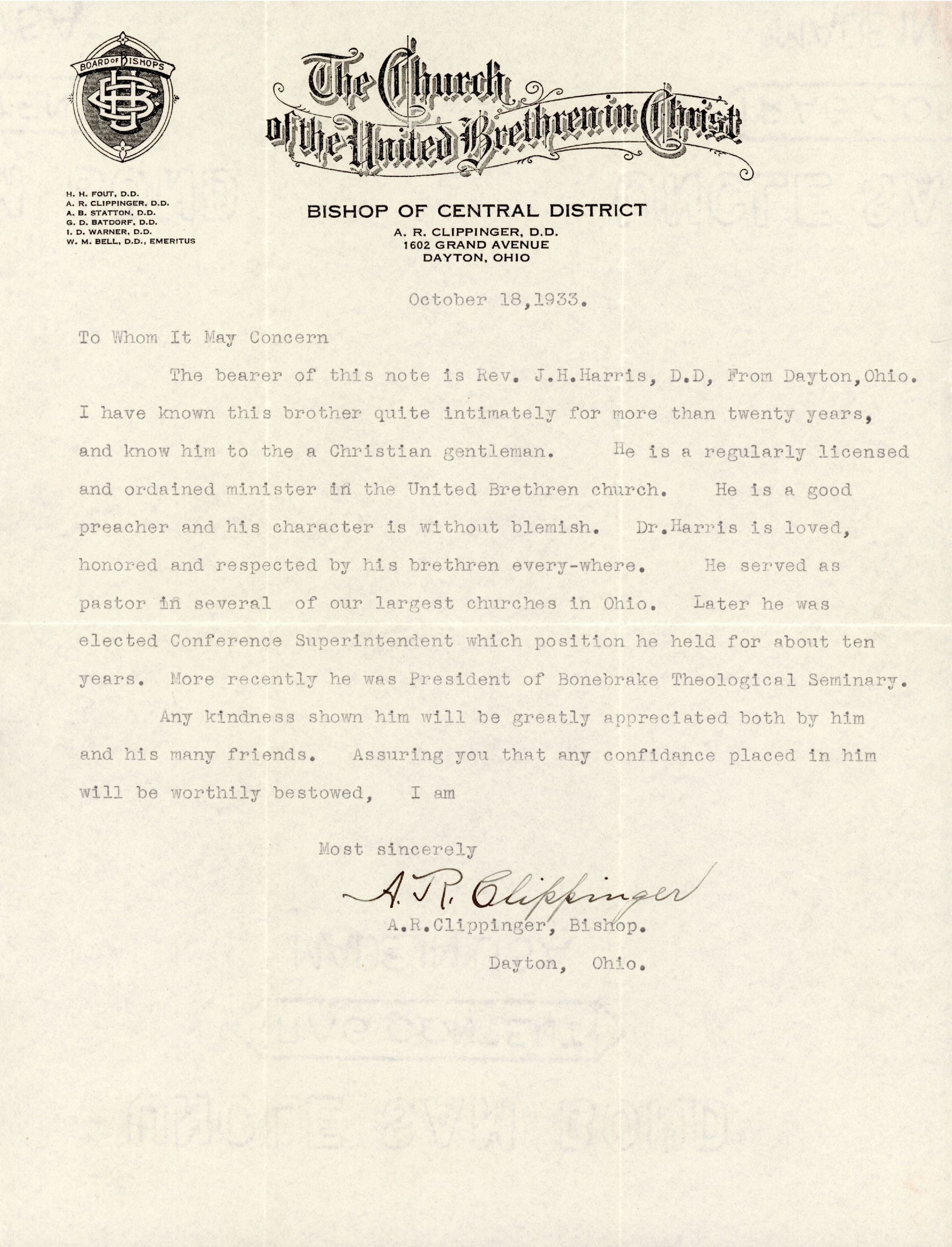 The bearer of this note is Rev. J.H.Harris, D.D, From Dayton, Ohio. I have known this brother quite intimately for more than twenty years, and know him to be a Christian gentleman. He is a regularly licensed and ordained minister in the United Brethren church. He is a good preacher and his character is without blemish. Dr. Harris is loved, honored and respected by his brethren every-where. He served as pastor in several of our largest churches in Ohio. Later he was elected Conference Superintendent which position he held for about ten years. More recently he was President of Bonebrake Theological Seminary.