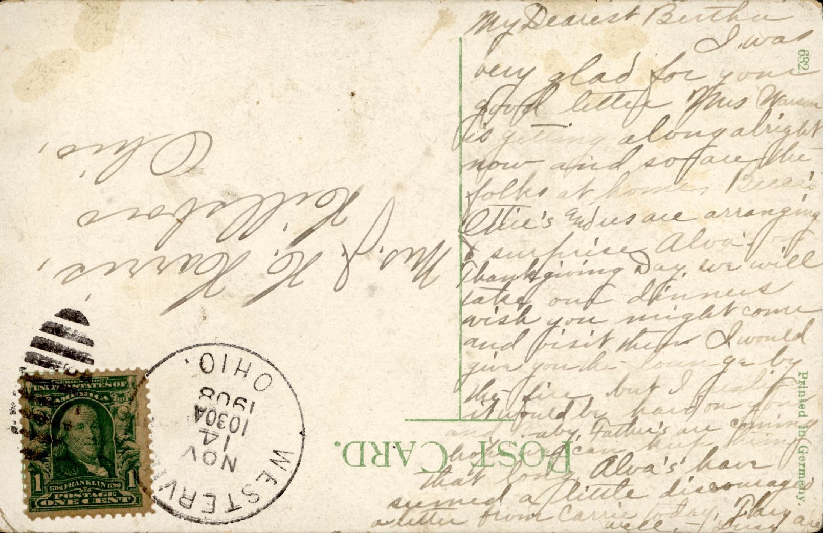 AU Lambert, Hannah Lucy [Mayne] - 1908-11-14 postcard to Bertha Elizabeth LambertEntry/Object ID