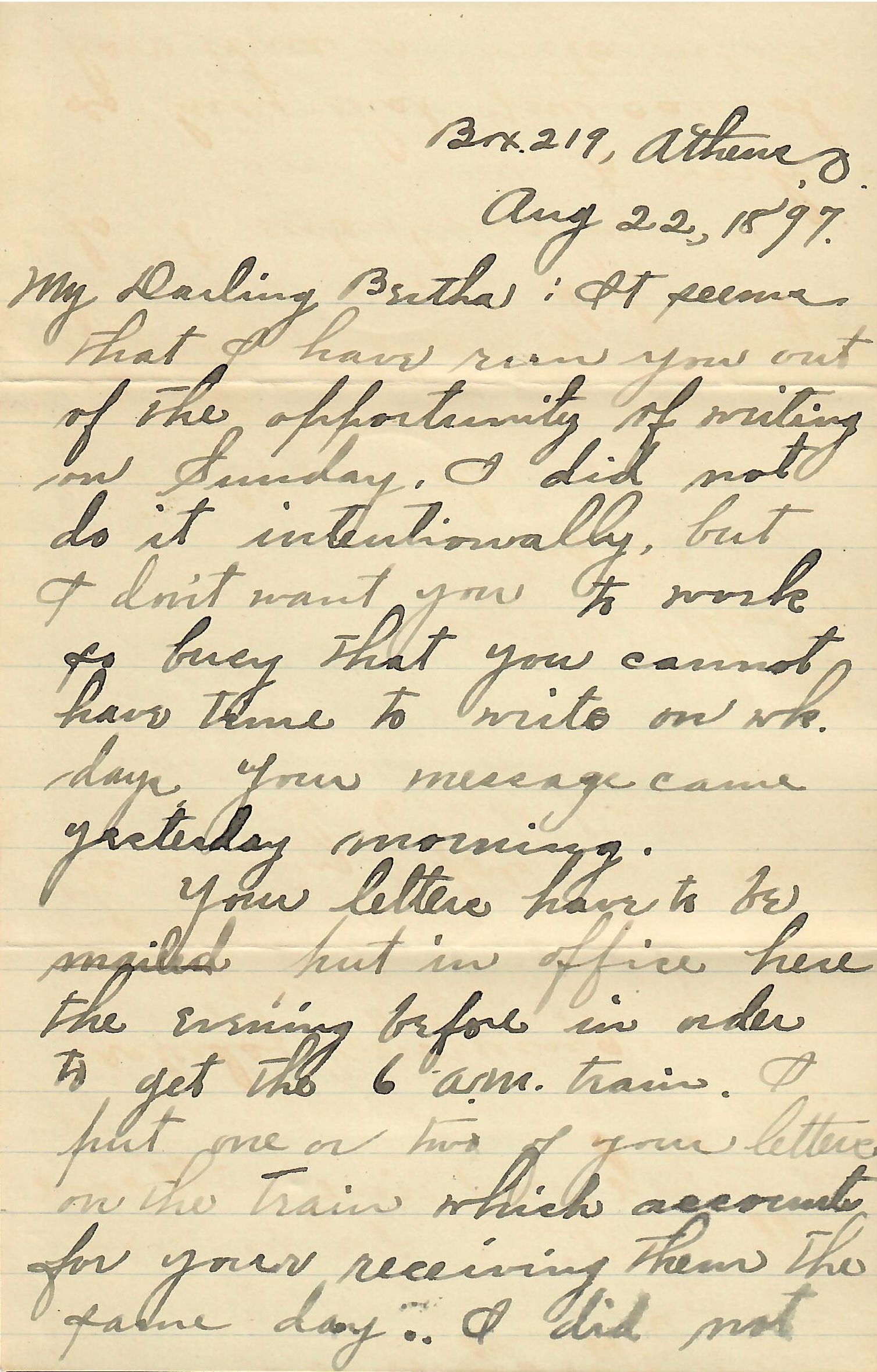 [Box 219, Athens, OH, to Miss Bertha Lambert, Westerville, Ohio, “Franklin Co.”]