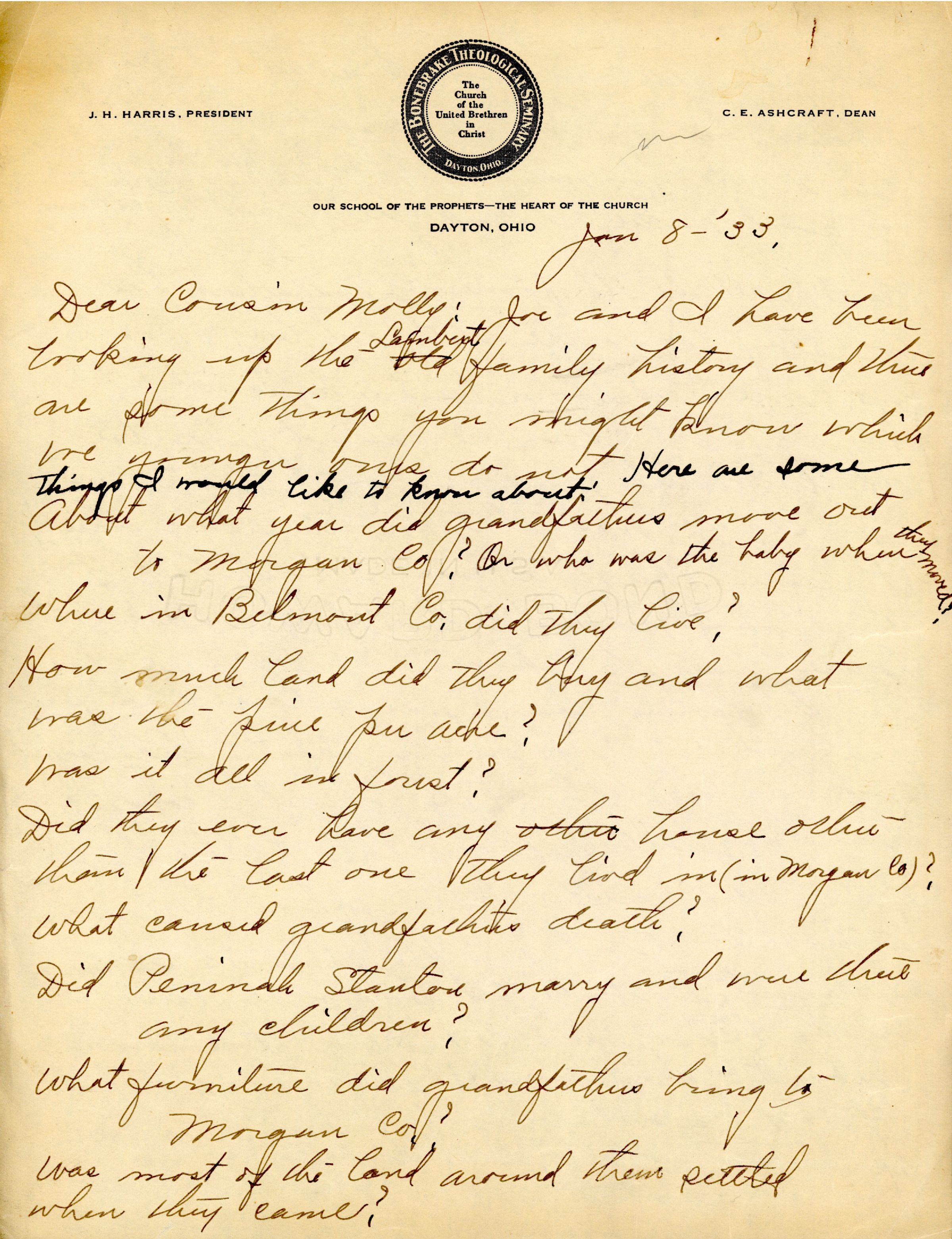 Dear Cousin Molly: Joe and I have been looking up the Lambert family history and there are some things you might know which we younger ones do not. Here are some things I would like to know about.
