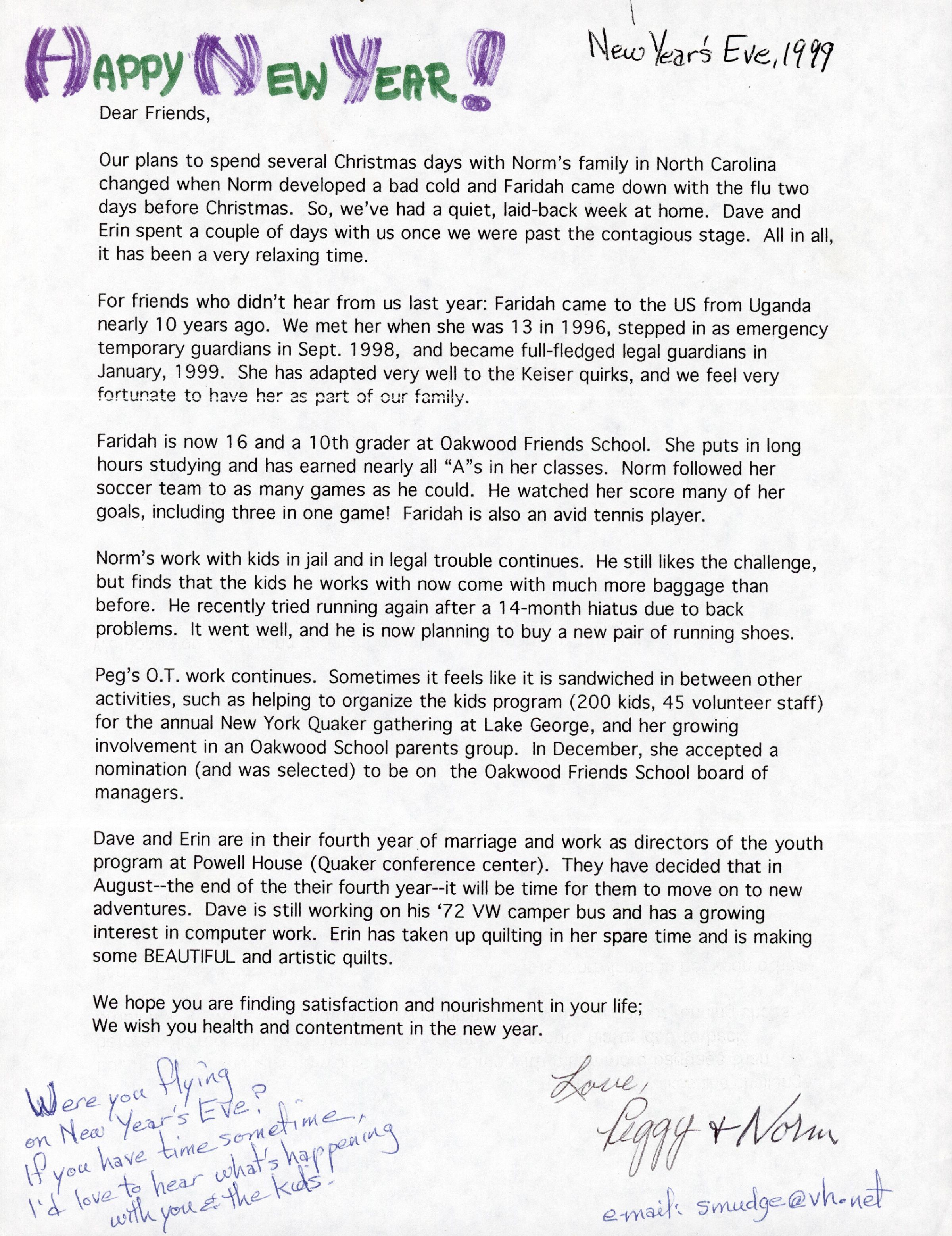 For friends who didn’t hear from us last year: Faridah came to the US from Uganda nearly 10 years ago. We met her when she was 13 in 1996, stepped in as emergency temporary guardians in Sept. 1998, and became full-fledged legal guardians in January, 1999. She has adapted very well to the Keiser quirks, and we feel very fortunate to have her as part of our family.