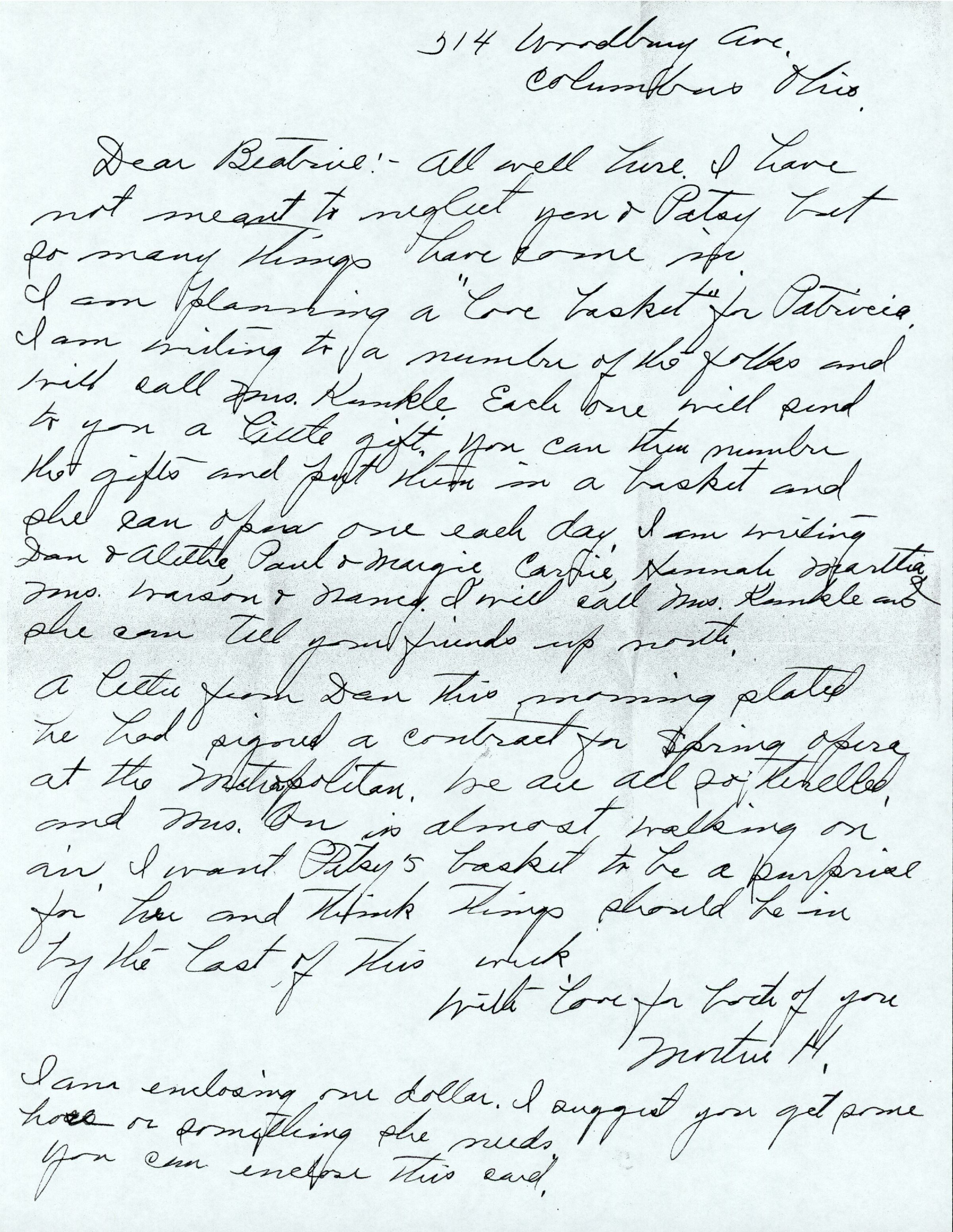 Dear Beatrice:- All well here. I have not meant to neglect you & Patsy but so many things have come in. I am planning a "love basket' for Patricia. I am writing to a number of the folks and will call Mrs Kunkle. Each one will send to you a cute little gift. You can then number the gifts and put them in a basket and she can open one each day. I am writing Dan & Aletha, Paul & Margie, Carrie, Hannah, Martha, Mrs. Warson & Nancy. I will call Mrs Kunkle and she can tell your friends up north.