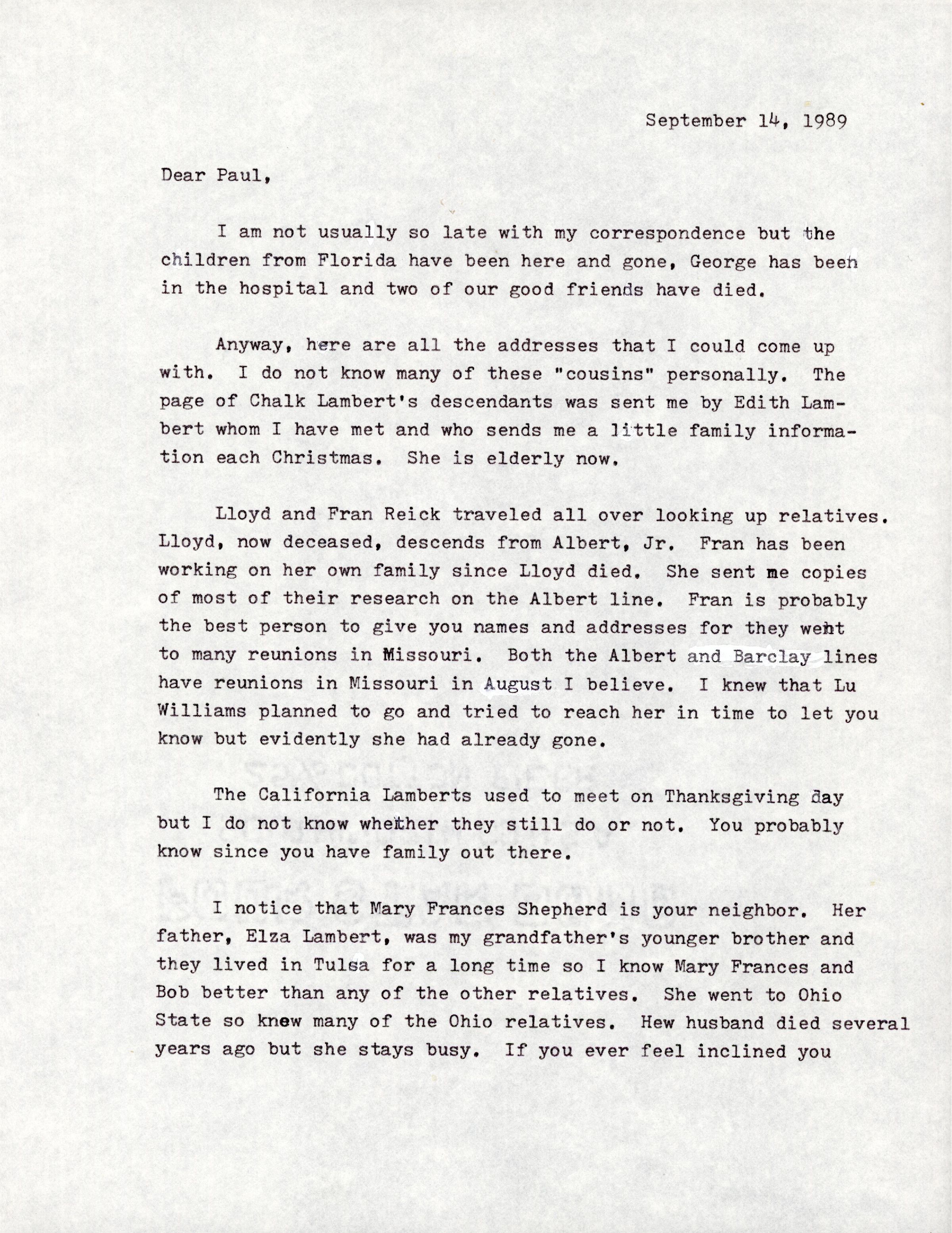 I notice that Mary Frances Shepherd is your neighbor. Her father, Elza Lambert, was my grandfather's younger brother and they lived in Tulsa for a long time so I know Mary Frances and Bob better than any of the other relatives. She went to Ohio State so knew many of the Ohio relatives. Her husband died several years ago but she stays busy. If you ever feel inclined you