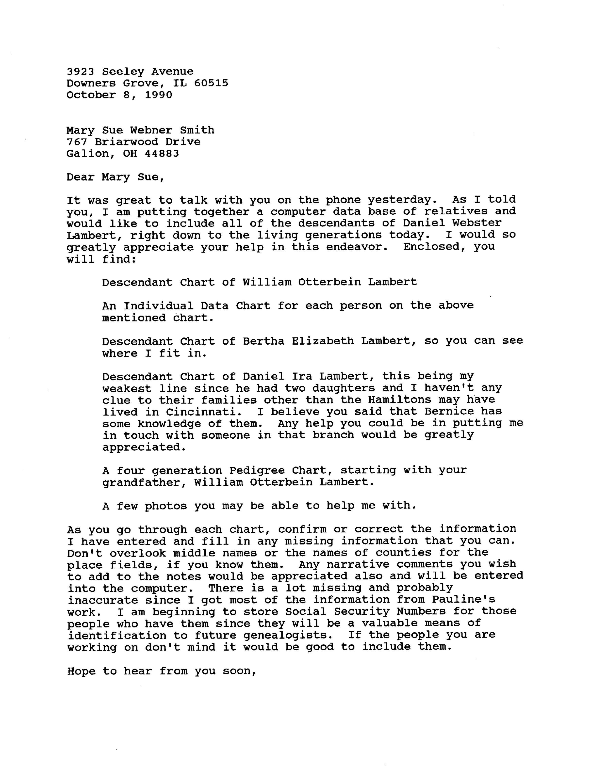 It was great to talk with you on the phone yesterday. As I told you, I am putting together a computer data base of relatives and would like to include all of the descendants of Daniel Webster Lambert, right down to the living generations today. I would so greatly appreciate your help in this endeavor. Enclosed, you will find:
