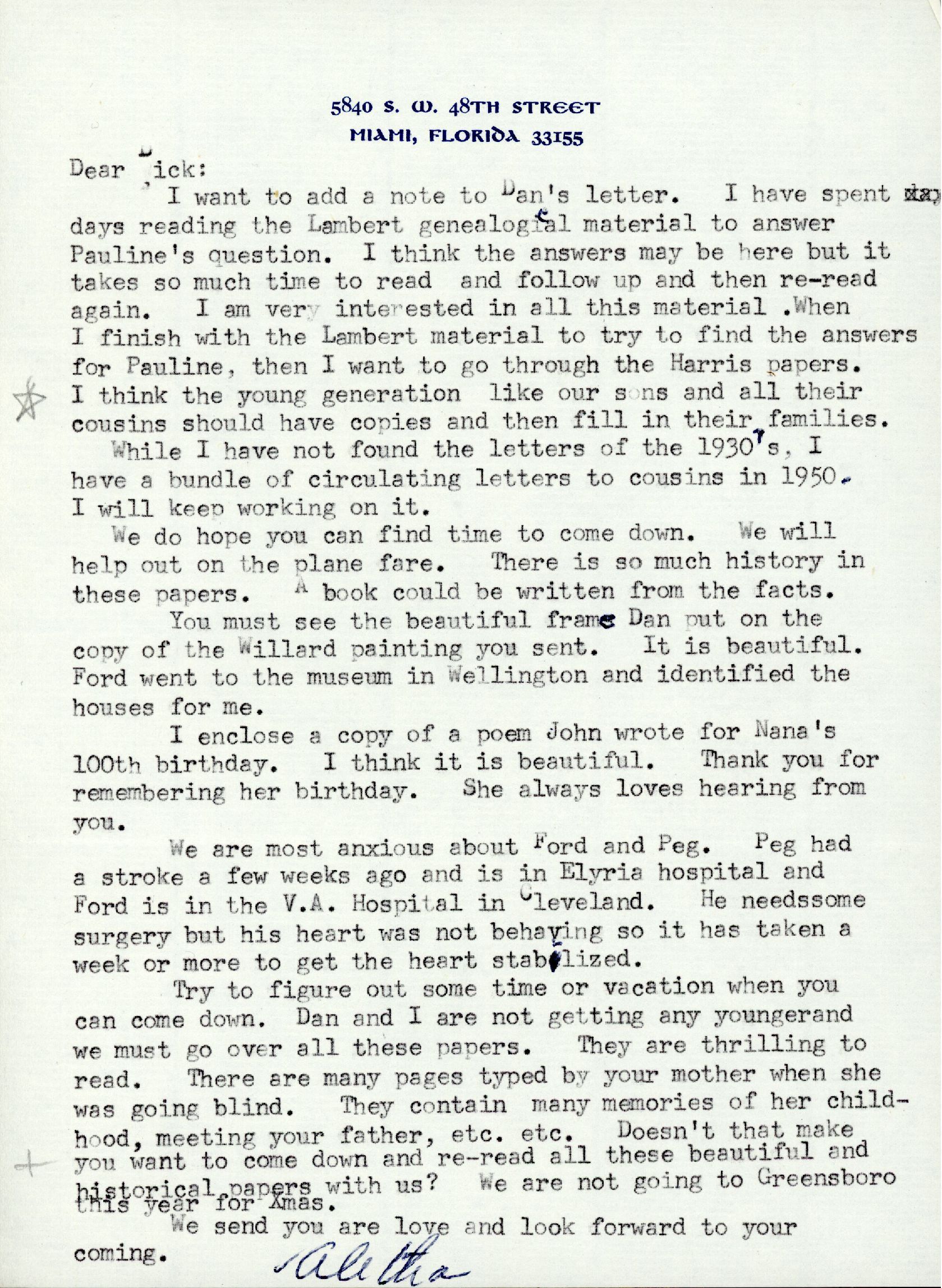 I want to add a note to Dan's letter. I have spent days reading the Lambert genealogical material to answer Pauline's question. I think the answers may be here but it takes so much time to read and follow up and then re-read again. I am very interested in all this material. When I finish with the Lambert material to try to find the answers for Pauline, then I want to go through the Harris papers. I think the young generation like our sons and all their cousins should have copies and then fill in their families.