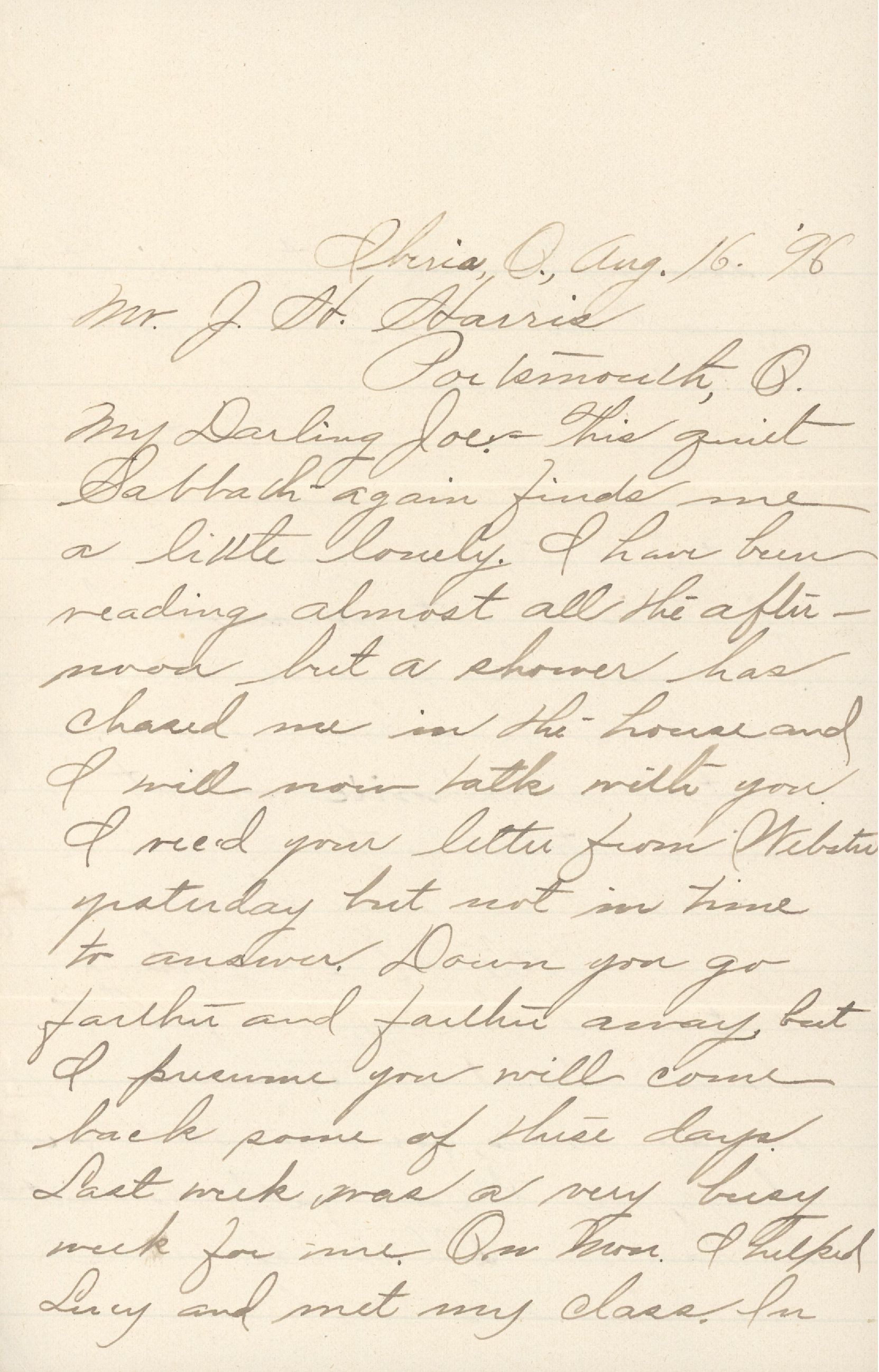 My Darling Joe: — This quiet Sabbath again finds me a little lonely. I have been reading almost all the afternoon but a shower has chased me in the house and I will now talk with you. I rec'd your letter from Webster yesterday but not in time to answer. Down you go farther and farther away, but I presume you will come back some of these days.