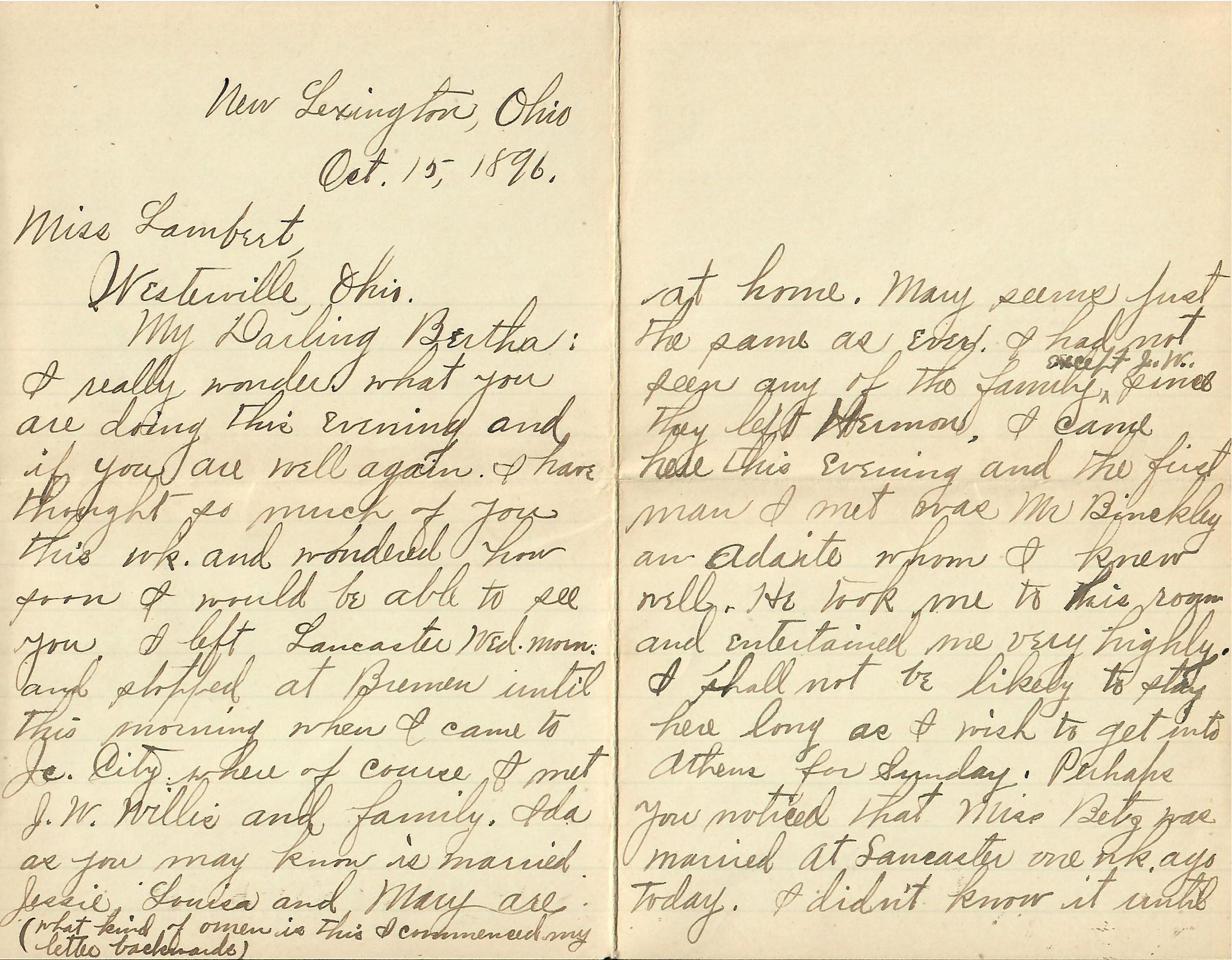 My Darling Bertha: I really wonder what you are doing this evening and if you are well again. I have thought so much of you this wk. and wondered how soon I would be able to see you. I left Lancaster Wed. morn. and stopped at Bremen until this morning when I came to Jc. City where of course I met J. W. Willis and family. Ida as you may know is married. Jesse, Louisa and Mary are (what kind of omen is this, I commenced my letter backwards [referring to the fold he started the letter on]) at home. Mary seems just the same as ever. I had not seen any of the family except J. W. since they left Hermon. I came here this evening and the first man I met was Mr Binckley an Adaite whom I knew well. He took me to his room and entertained me very highly. I shall not be likely to stay here long as I wish to get into Athens for Sunday. Perhaps you noticed that Miss Betz was married at Lancaster on wk. ago today. I didn't know it until the next day or I should have been tempted to be present. Willis gave partial reports of conference and I learn that Mr Lambert is more favored in his work this yr than last and of course we are all glad to know that is true. I have that picture before me again and am talking to it but you seem a little selfish(?) tonight as you won't look at me at all. But I guess you did not care about looking at me much when that was taken at any rate, but that makes no difference now.