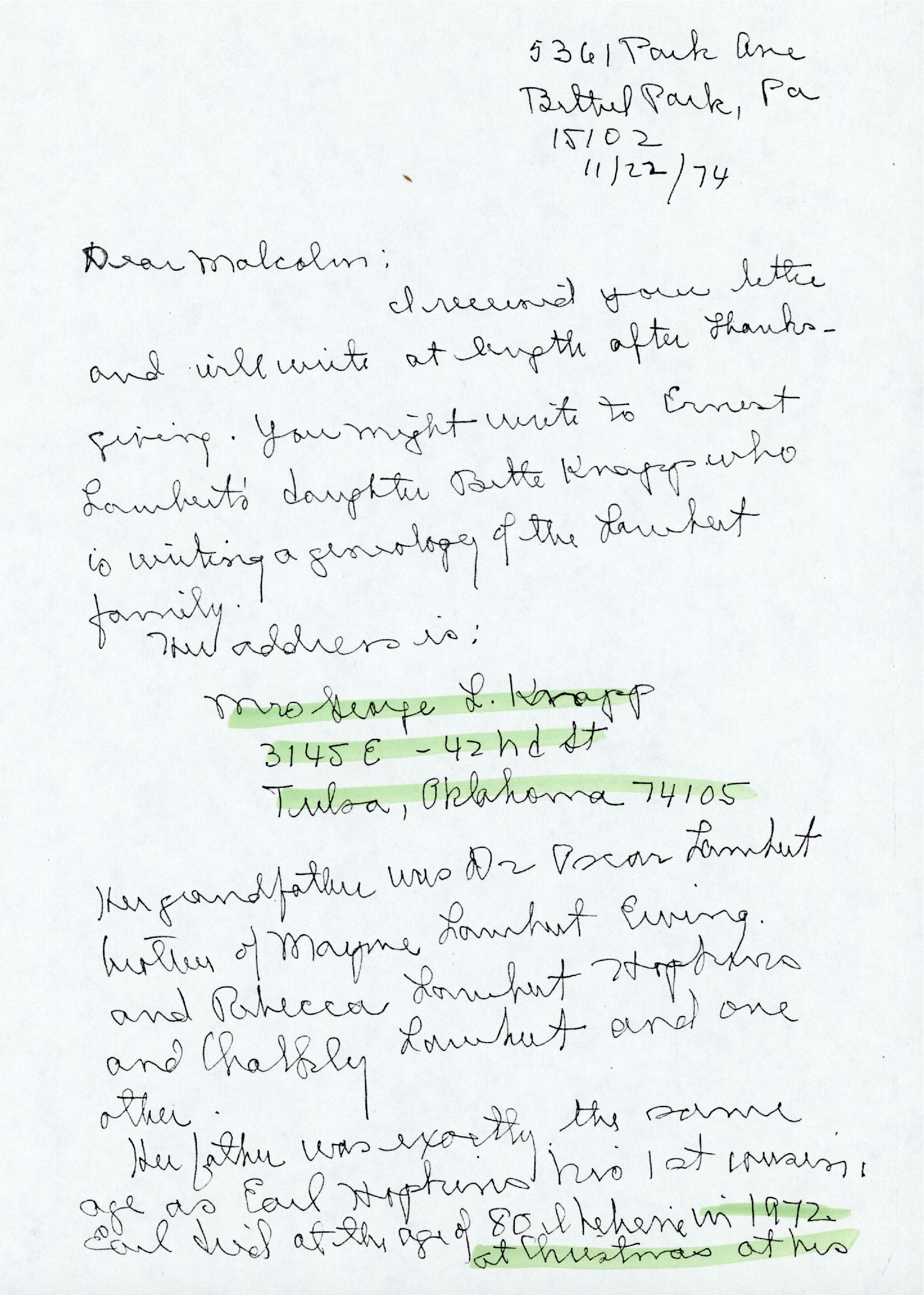 I received your letter and will write at length after Thanksgiving. You might write to Ernest Lambert's daughter Bette Knapp who is writing a genealogy of the Lambert family.