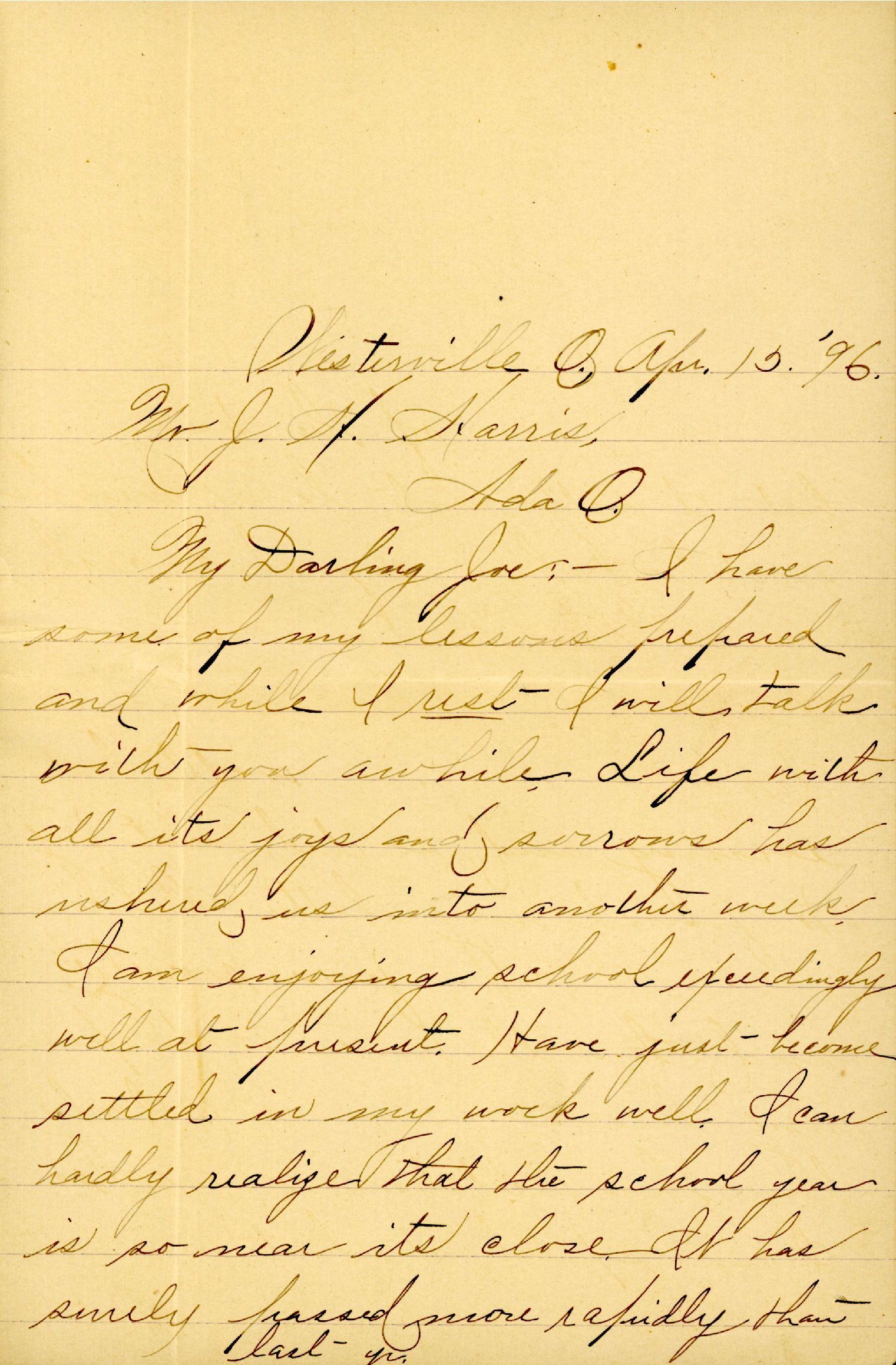 My Darling Joe: — I have some of my lessons prepared and while I rest I will talk with you awhile. Life with all its joys and sorrows has ushered us into another week. I am enjoying school exceedingly well at present. Have just become settled in my work well. I can hardly realize that the school year is so near its close. It has surely passed more rapidly than last year.
