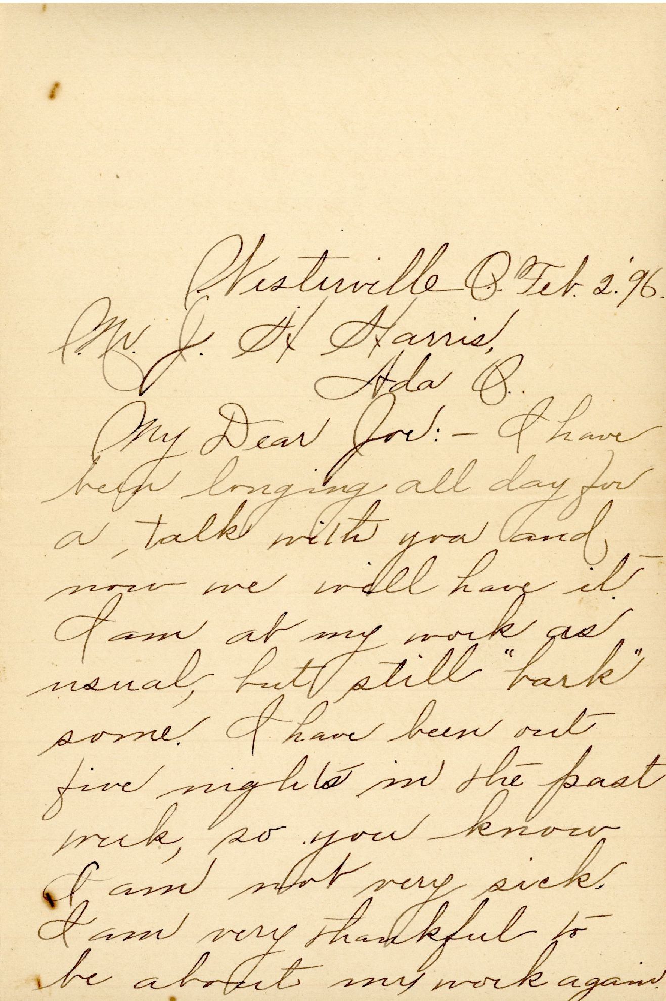 My Dear Joe: — I have been longing all day for a talk with you and now we will have it. I am at my work as usual, but still “bark” some. I have been out five nights in the past week, so you know I am not very sick. I am very thankful to be about my work again.