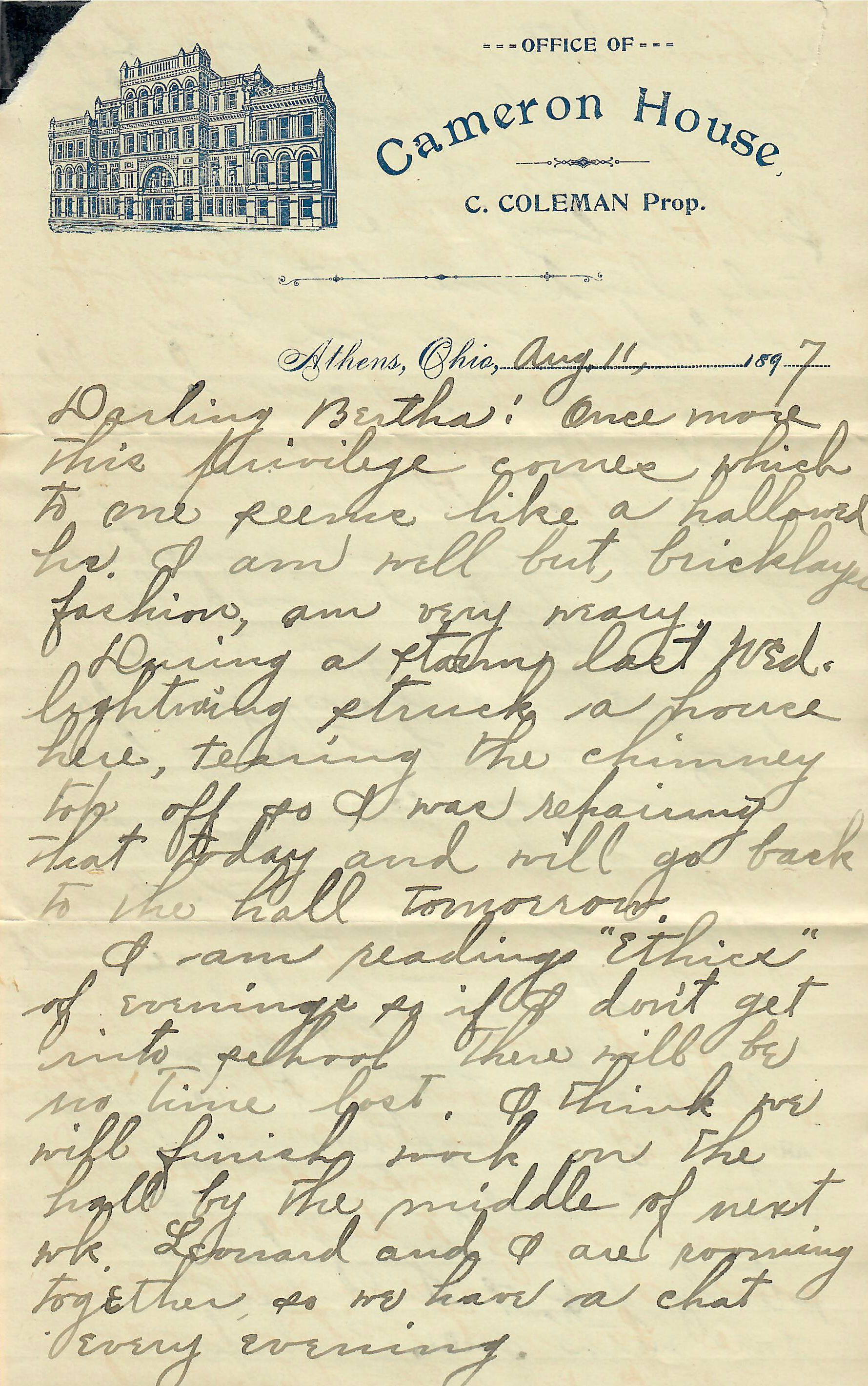 [Box 219, Athens, OH, to Miss Bertha Lambert, Westerville, Ohio, “Franklin Co.;” stationery from Cameron House.]