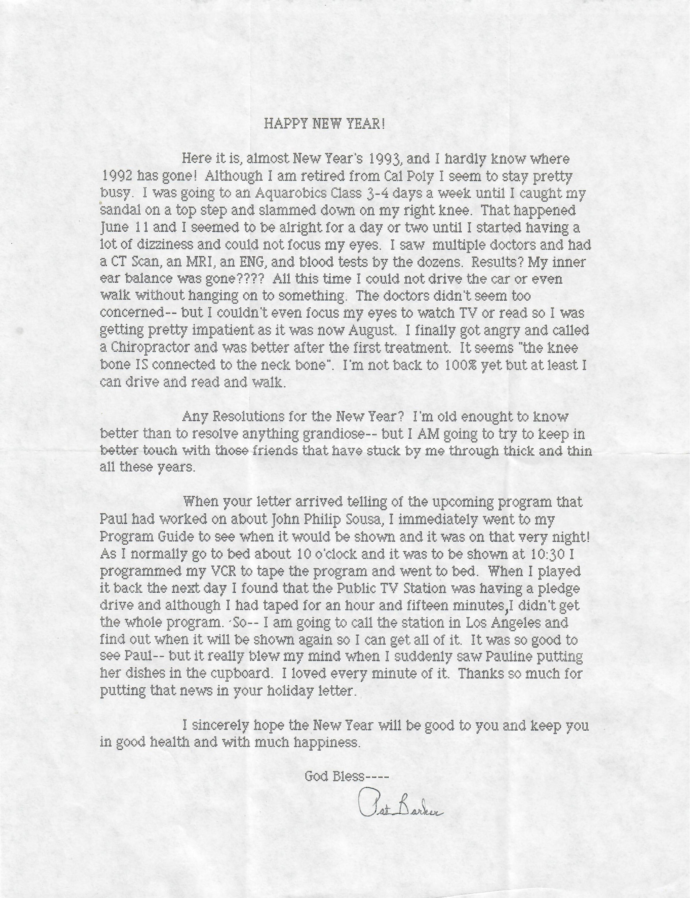When your letter arrived telling of the upcoming program that Paul had worked on about John Philip Sousa, I immediately went to my Program Guide to see when it would be shown and it was on that very night! As I normally to to bed about 10 o'clock and it was to be shown at 10:30 I programmed my VCR to tape the program and went to bed. When I played it back the next day I found that the Public TV Station was having a pledge drive and although I had taped for an hour and fifteen minutes, I didn't get the whole program. So-- I am going to call the station in Los Angeles and find out when it will be shown again so I can get all of it. It was so good to see Paul-- but it really blew my mind when I suddenly saw Pauline putting her dishes in the cupboard. I loved every minute of it. Thanks so much for putting that news in your holiday letter.