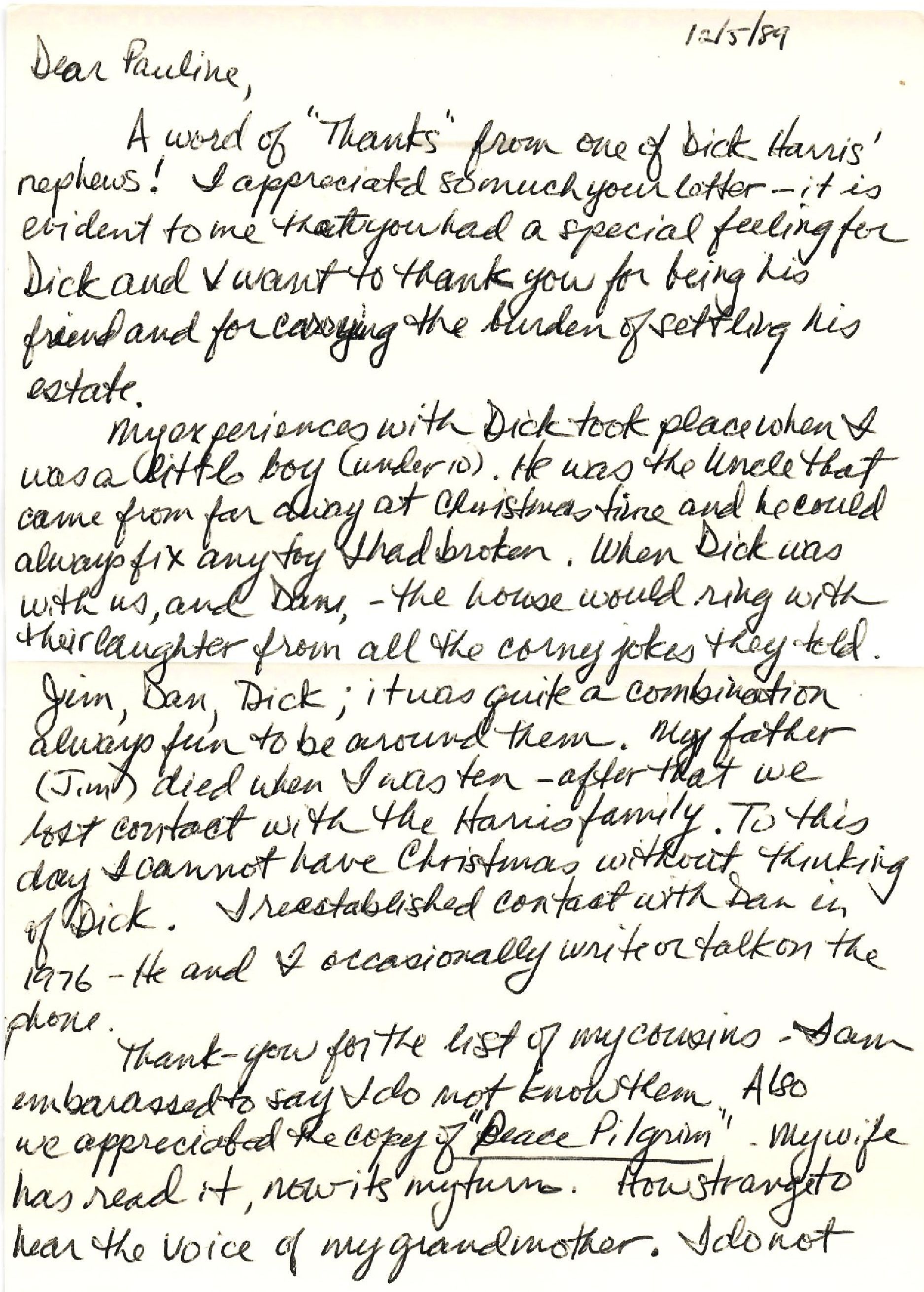 A word of "Thanks" from one of Dick Harris' nephews! I appreciated so much your letter — it is evident to me that you had a special feeling for Dick and I want to thank you for being his friend and for carrying the burden of settling his estate.