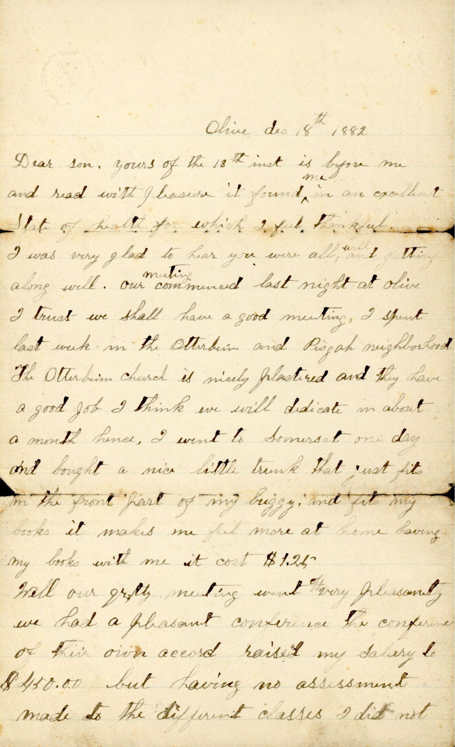 Dear son, yours of the 13th inst is before me and read with pleasure it found me in an excellent State of health for which I feel thankful. I was very glad to hear you were all well and getting along well. Our meeting commenced last night at Olive I trust we shall have a good meeting, I spent last week in the Otterbein and Pisgah neighborhood. The Otterbein church is nicely plastered and they have a good job I think we will dedicate in about a month hence, I went to Somerset one day and bought a nice little trunk that just fits in the front part of my buggy, and fits my books it makes me feel more at home having my books with me it cost $1.25