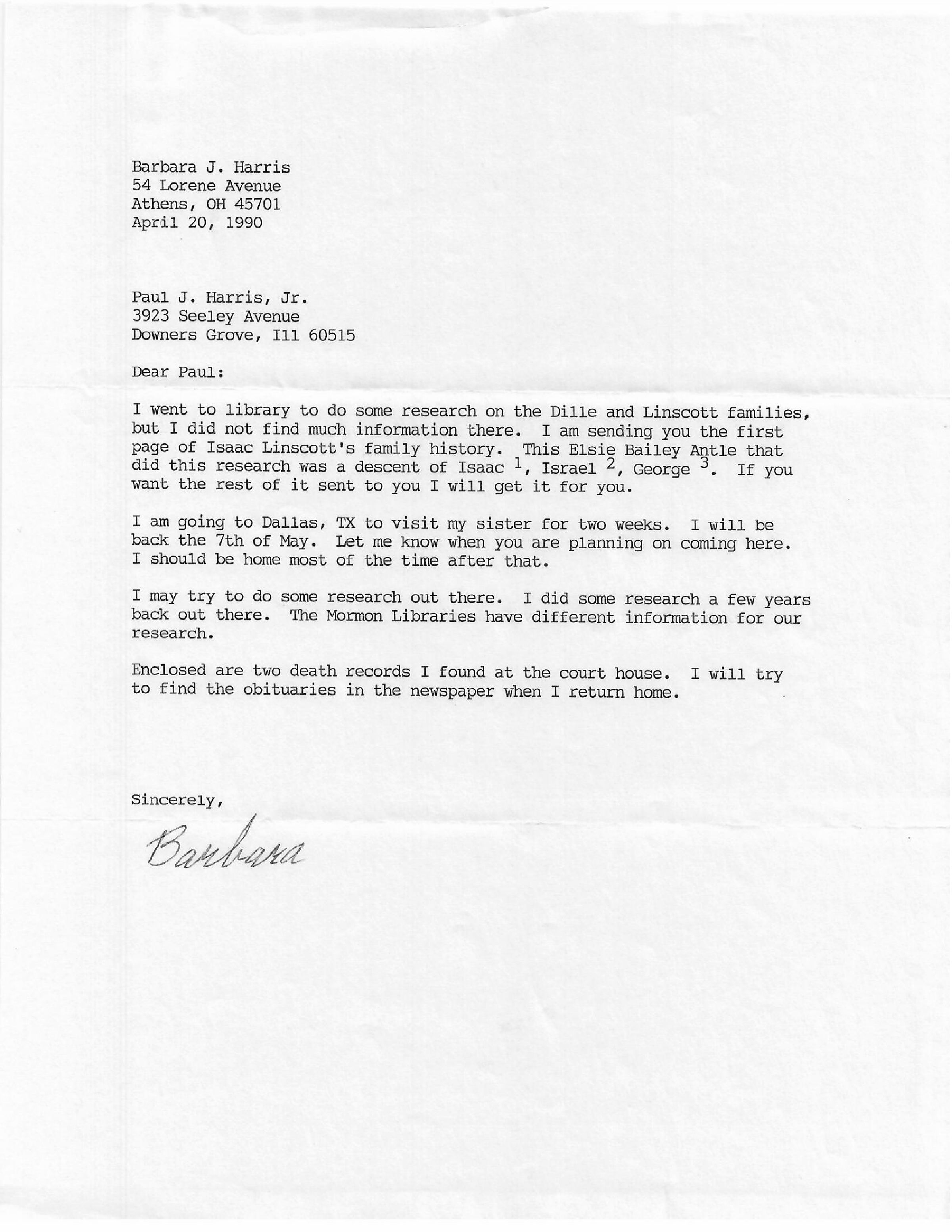AU Gooding, Barbara [Harris] - 1990-04-20 letter to Paul J. Harris, Jr.Entry/Object ID