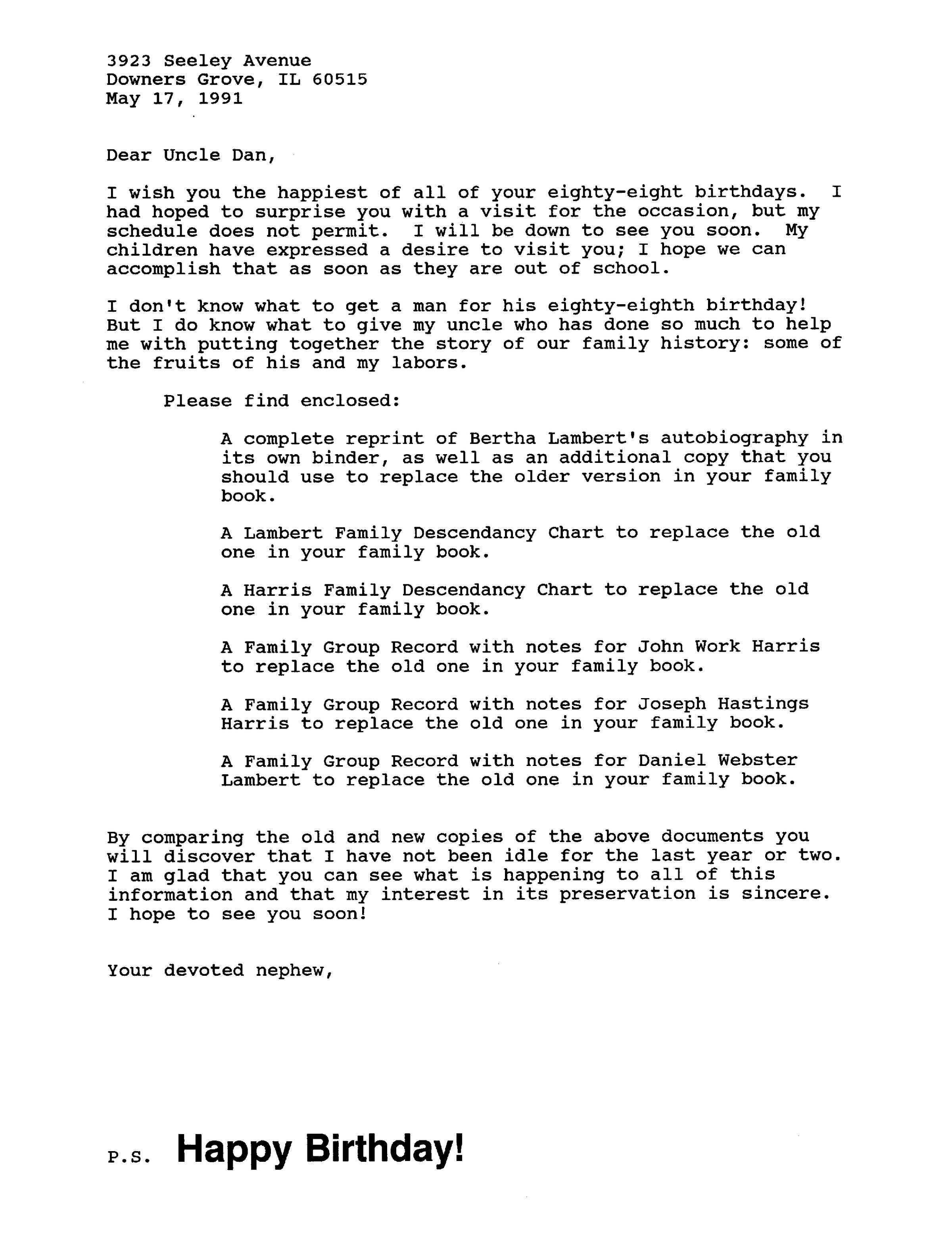 I wish you the happiest of all of your eighty-eight birthdays. I had hoped to surprise you with a visit for the occasion, but my schedule does not permit. I will be down to see you soon. My children have expressed a desire to visit you; I hope we can accomplish that as soon as they are out of school.