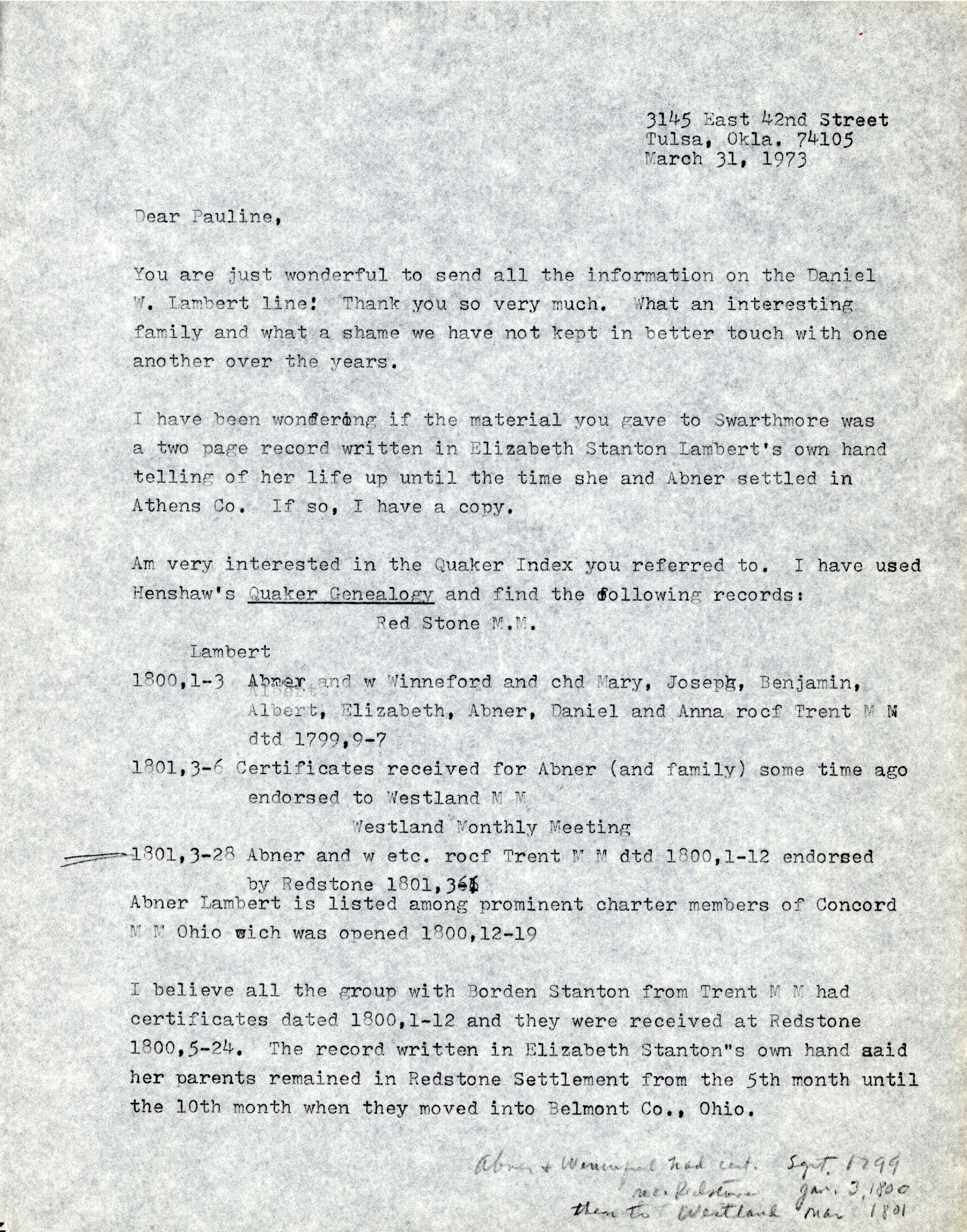 I have been wondering if the material you gave to Swarthmore was a two page record written in Elizabeth Stanton Lambert's own hand telling of her life up until the time she and Abner settled in Athens Co. If so, I have a copy.